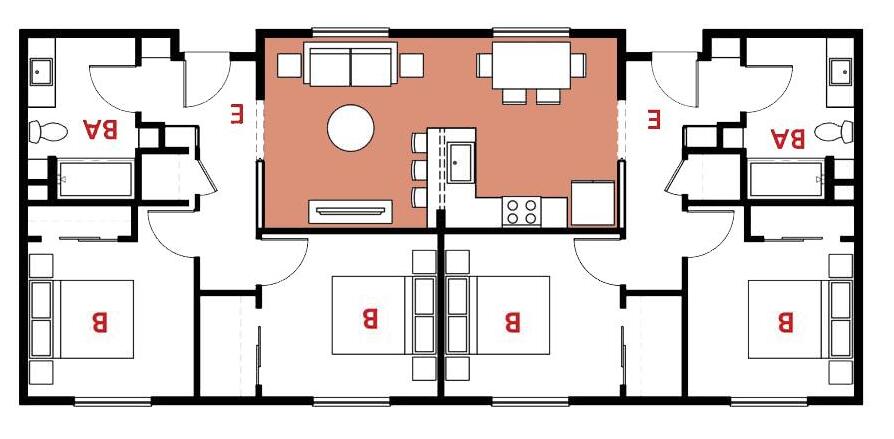 SHARED EFFICIENCY HOUSING MODULE THAT CENTRALIZES COMMON SPACE TO BE SHARES WITH THE RESIDENTS WITHIN THEIR PODS