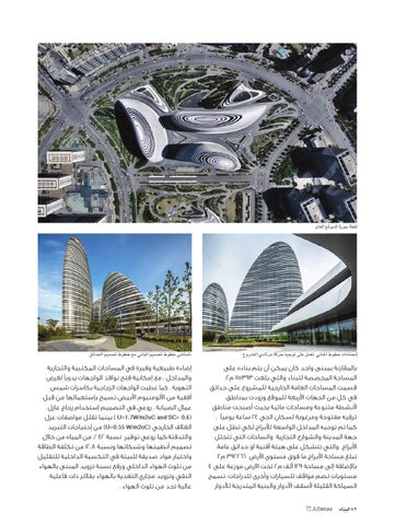 إﺿﺎءة ﻃﺒﻴﻌﻴﺔ وﻓﻴﺮة ﻓﻲ اﻟﻤﺴﺎﺣﺎت اﻟﻤﻜﺘﺒﻴﺔ واﻟﺘﺠﺎرﻳﺔ واﻟﻤﺪاﺧﻞ ،ﻣﻊ إﻣﻜﺎﻧﻴﺔ ﻓﺘﺢ ﻧﻮاﻓﺬ اﻟﻮاﺟﻬﺎت ﻳﺪوﻳ Eﻟﻐﺮض اﻟﺘﻬﻮﻳﺔ .ﻛﻤﺎ ﻏﻄﻴﺖ اﻟﻮاﺟﻬﺎت اﻟﺰﺟﺎﺟﻴﺔ ﺑﻜﺎﺳﺮات ﺷﻤﺲ أﻓﻘﻴﺔ ﻣﻦ ا;ﻟﻮﻣﻨﻴﻮم ا;ﺑﻴﺾ ﺗﺴﻤﺢ ﺑﺈﺳﺘﻌﻤﺎﻟﻬﺎ ﻣﻦ ﻗﺒﻞ ﻋﻤﺎل اﻟﺼﻴﺎﻧﺔ .روﻋﻲ ﻓﻲ اﻟﺘﺼﻤﻴﻢ إﺳﺘﺨﺪام زﺟﺎج ﻋﺎزل ) ( U=1.7W/m2oC and SC= 0.4ﺑﻴﻨﻤﺎ ﺗﻘﻠﻞ ﻣﻮاﺻﻔﺎت ﻋﺰل اﻟﻐﻼف اﻟﺨﺎرﺟﻲ ) (U=0.55 W/m2oCﻣﻦ إﺣﺘﻴﺎﺟﺎت اﻟﺘﺒﺮﻳﺪ واﻟﺘﺪﻓﺌﺔ،ﻛﻤﺎ روﻋﻲ ﺗﻮﻓﻴﺮ ﻧﺴﺒﺔ ٪ ٤٢ﻣﻦ اﻟﻤﻴﺎه ﻣﻦ ﺧﻼل ﺗﺼﻤﻴﻢ أﻧﻈﻤﺘﻬﺎ وﺷﺒﻜﺎﺗﻬﺎ وﻧﺴﺒﺔ ١٢،٨ﻣﻦ ﺗﻜﻠﻔﺔ اﻟﻄﺎﻗﺔ واﺧﺘﻴﺎر ﻣﻮاد ﺻﺪﻳﻘﺔ ﻟﻠﺒﻴﺌﺔ ﻓﻲ اﻟﺘﻜﺴﻴﺔ اﻟﺪاﺧﻠﻴﺔ ﻟﻠﺘﻘﻠﻴﻞ ﻣﻦ ﺗﻠﻮث اﻟﻬﻮاء اﻟﺪاﺧﻠﻲ ورﻓﻊ ﻧﺴﺒﺔ ﺗﺰوﻳﺪ اﻟﻤﺒﻨﻰ ﺑﺎﻟﻬﻮاء اﻟﻨﻘﻲ وﺗﺰوﻳﺪ ﻣﺠﺎري اﻟﺘﻐﺬﻳﺔ ﺑﺎﻟﻬﻮاء ﺑﻔﻼﺗﺮ ذات ﻓﺎﻋﻠﻴﺔ ﻋﺎﻟﻴﺔ ﺗﺤﺪ ﻣﻦ ﺗﻠﻮث اﻟﻬﻮاء .