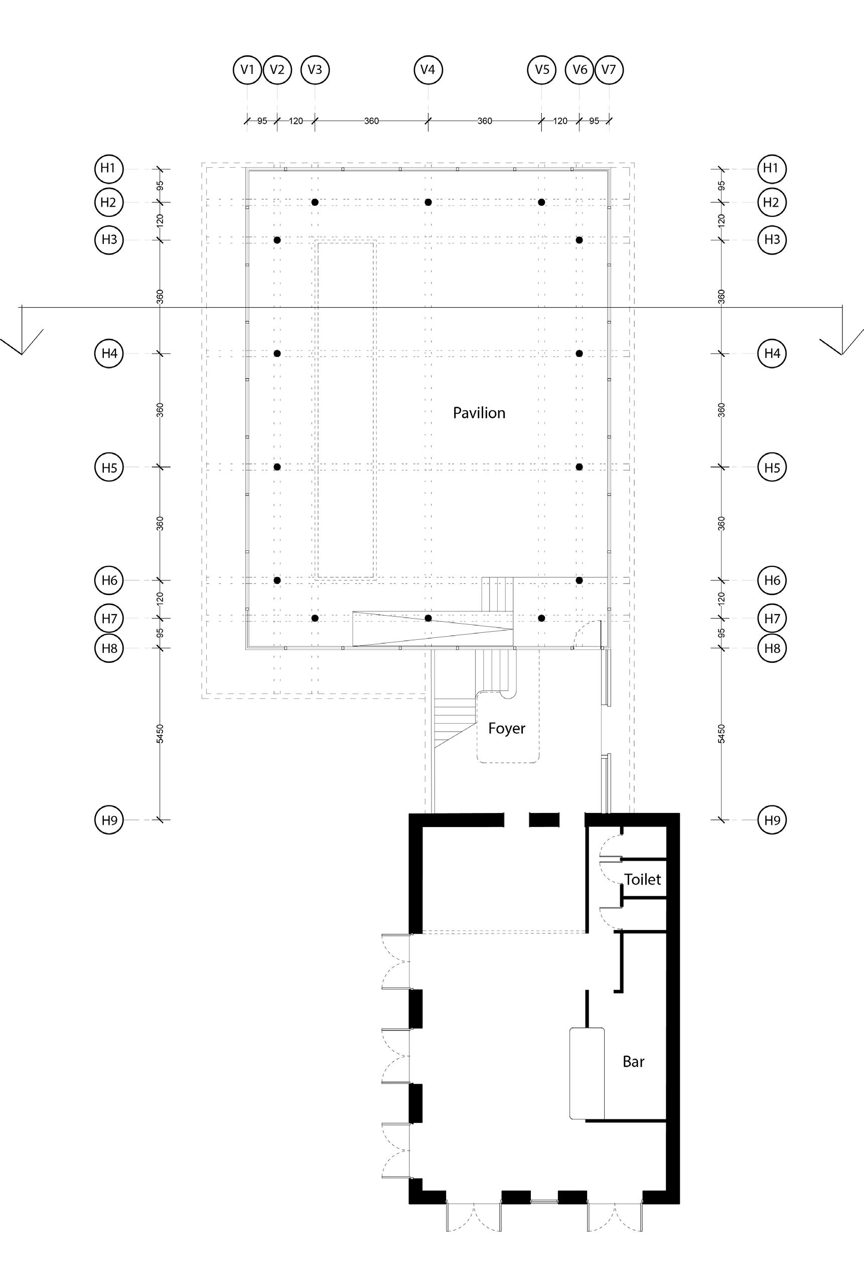 Sectional view of pavilion and view of the stable