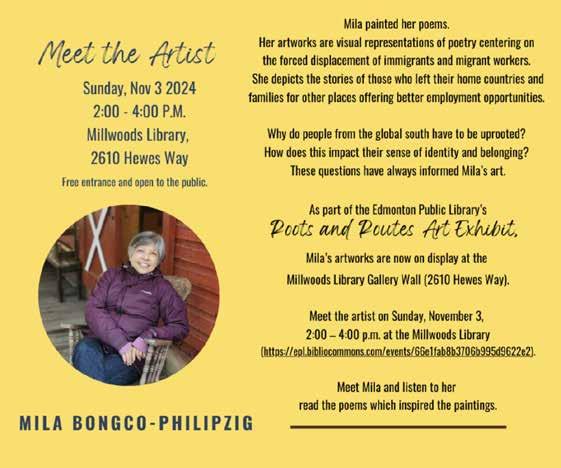 I spoke to Mila BongcoPhilipzig, whose artwork is featured in the Mill Woods EPL’s inaugural exhibit. When the call for art was released with the theme Roots & Routes, what Mila had in mind were mostly paintings of poems she wrote about immigration and migrant workers. Her art