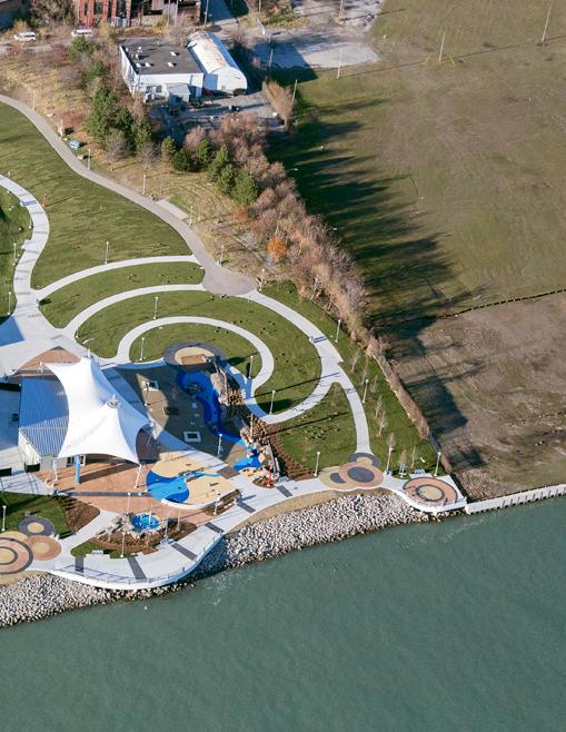 Albert Kahn Associates has been instrumental in the master planning of Detroit’s riverfront, transforming underutilized spaces into vibrant public destinations that connect the community to the waterfront. In the final phase of RiverWalk East, Kahn revitalized the historic Uniroyal property into a linear park that links parks and promenades from the MacArthur Bridge to downtown, creating accessible pathways for walking, running, and cycling. At Mt. Elliott Park, Kahn engaged the community to reimagine the space with features like the “Great Lakes Beached Schooner” water feature, while also implementing sustainable elements such as stormwater-harvesting cisterns.