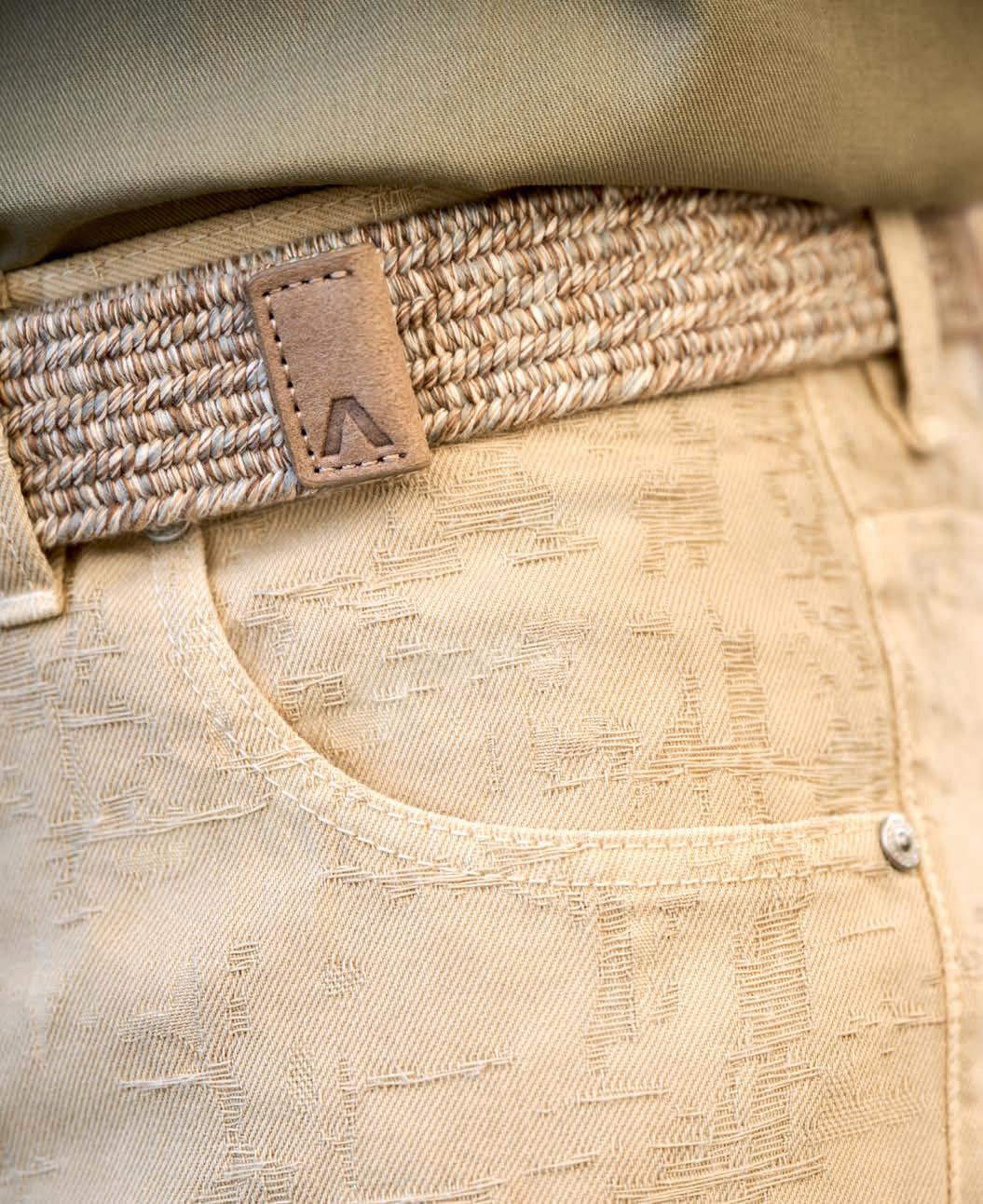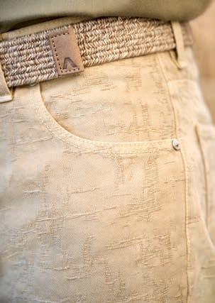 Was passiert, wenn man den bislang vor allem in Denimzirkeln angesagten Heavy Used-Look edlem Jacquard-Gewebe angedeihen lässt, dokumentiert ALBERTO mit der brandneuen ‚Fancy Jacquard‘. Gefertigt aus 100% Baumwolle in hochwertigen 11,5 oz-Qualitäten, präsentiert sich das lässige Wide-Fit-Modell mit einer bearbeiteten Oberfläche, die der Webstruktur einen höchst uniquen Charakter verpasst. Erhältlich ist das one of a kind-Fashion Piece, das kombiniert mit einem schlichten kontrastfarbenen Shirt für einen topmodischen Auftritt sorgt, wahlweise in Beige oder Off-White.