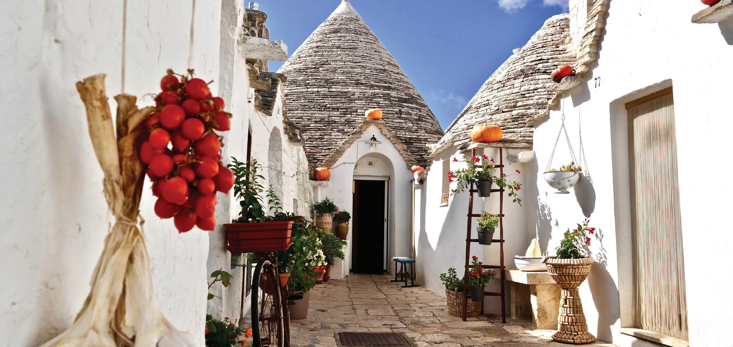 Continuando para Este, entramos no Vale dos Trulli. Esta região de Puglia oferece paisagens fantásticas, compostas por olivais, terra vermelha, vinhas e os Trulli, edifícios de pedra em forma de cone, símbolo de Puglia e Património Mundial pela UNESCO.