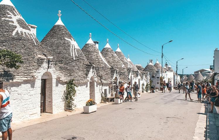 A cidade dos Trulli, casas típicas de calcário, exemplos extraordinários de construções em lajes de pedra seca, técnica que remonta aos tempos pré-históricos. Aqui encontra os exemplos mais bem conservados, com mais de 1.500 estruturas nos bairros Monti e Aja Piccola. Os telhados dos edifícios ostentam frequentemente inscrições em cinza branca com significados mitológicos ou religiosos, terminando geralmente com um pináculo decorativo destinado a afastar as más influências ou a má sorte.