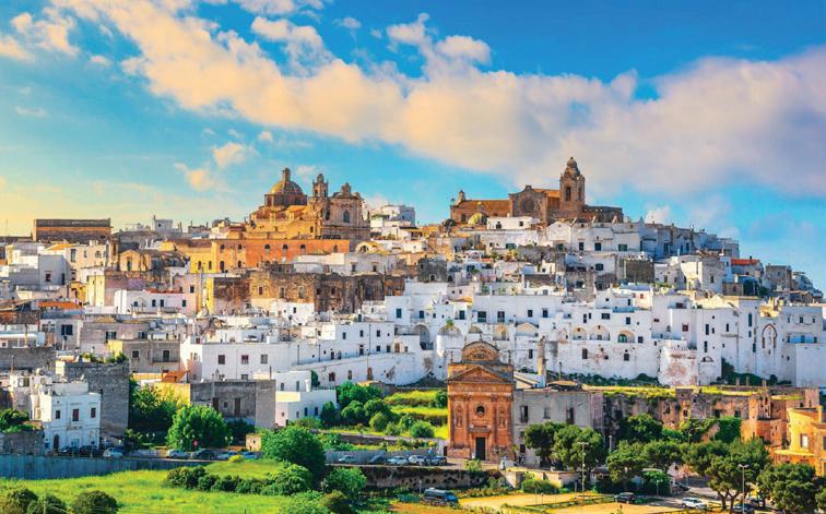 Ostuni é famosa pelas suas casas pintadas de branco, dominadas pela Catedral. Situa-se a 8 km da costa do Adriático, e apresenta-se pontilhado por fiadas de oliveiras centenárias, que tornam a paisagem verdadeiramente deslumbrante. Aqui a cor branca domina: o branco da caixa basse e das ruas estreitas do centro histórico, outrora rodeado pelas muralhas aragonesas, das quais restam atualmente, poucos vestígios.