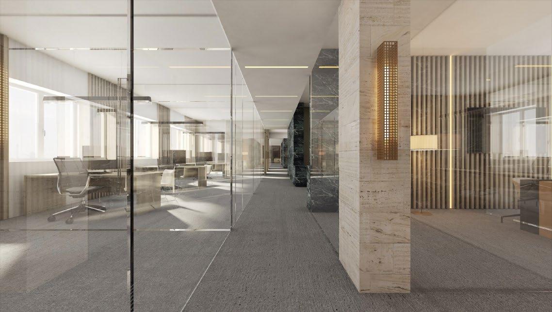 The project for the present office space, designed for a British investment fund, stems from the client’s need to accommodate a directional office, four smaller offices, an open workspace, and two separate meeting rooms (connected by a folding wall for added flexibility). The great depth of the unit required a solution where closed walls were largely replaced with transparent materials. Together with fine wood and stone cladding, these elements bring an atmosphere of elegance and lightness to the space. I independently developed the office layout and overall concept, delivering the project within a very short deadline.