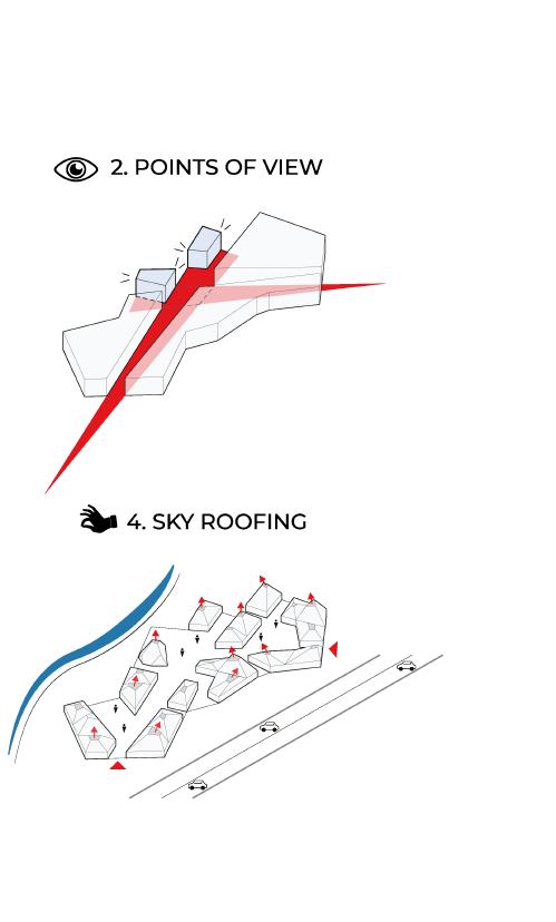 panoramic terrace on the top floor the project aims to increase the amount of sunlight coming into the building. A key role in the project is additionally played by the optical cone theme, which is dveloped horizontally at the entrance as an ‘invitation to enter and in the angled roof structure to emphasize the view towards the valley. The utmost attention was additionally given to the rooms exposure, with almost no opening facing north, as well as to local architectural features and flows, with guests’ flows being always separated from staff.