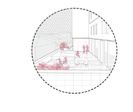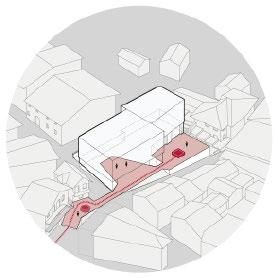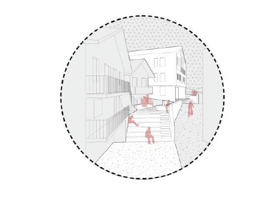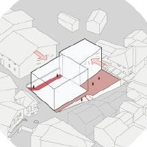 social hub, hosting a central gathering space and smaller meeting areas, while all public ground-floor rooms open toward it. A new pathway links the street to this inner square, enhancing neighborhood connectivity. The upper floors house student residences, with shared indoor and outdoor spaces on each level. Coccio pesto stone cladding on the ground floor integrates the building with its surroundings.