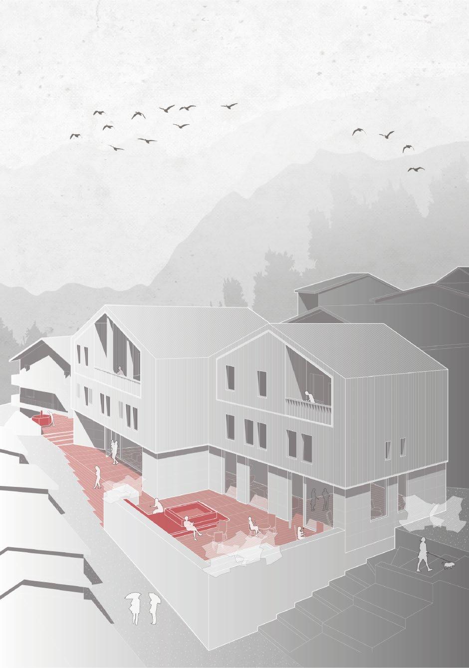The project, located in the Italian alpine ski resort of Sauze d’Oulx originates from the need to design a touristic hotel and, at the same time, to give back to the city the space that the building occupies. In such terms, the building provides a very open layout on the ground floor, as well as a series of outdoor spaces accessible to everyone. The building is found in a highly densified urban context with very little sunlight coming in during the day. While providing a building set back from the street boundary and by placing some common spaces and a
