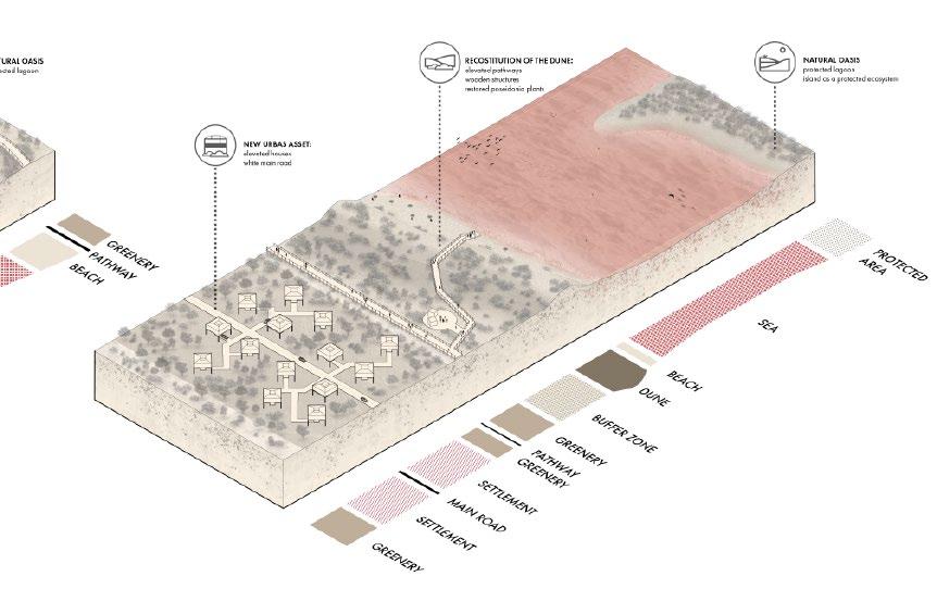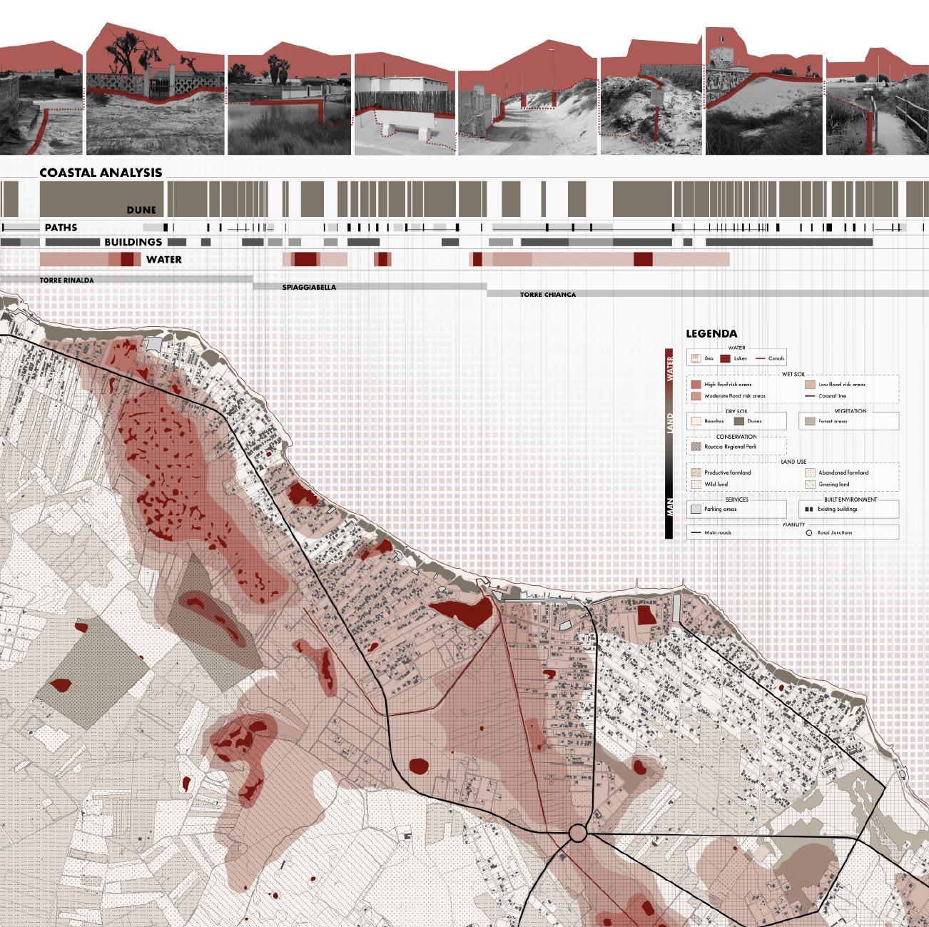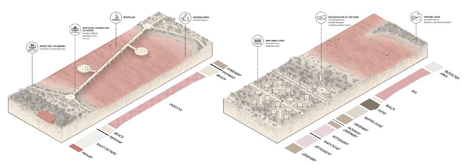 risk of damage, as highlighted by simulation models. The project focuses on creating new centralities and ways of living, inspired by past coastal settlements, and enhancing connections with inland areas. Additionally, establishing green areas and a vast natural park is crucial, as dune ecosystems can act as a barrier against rising sea levels, similar to their historical role before recent human disruptions.