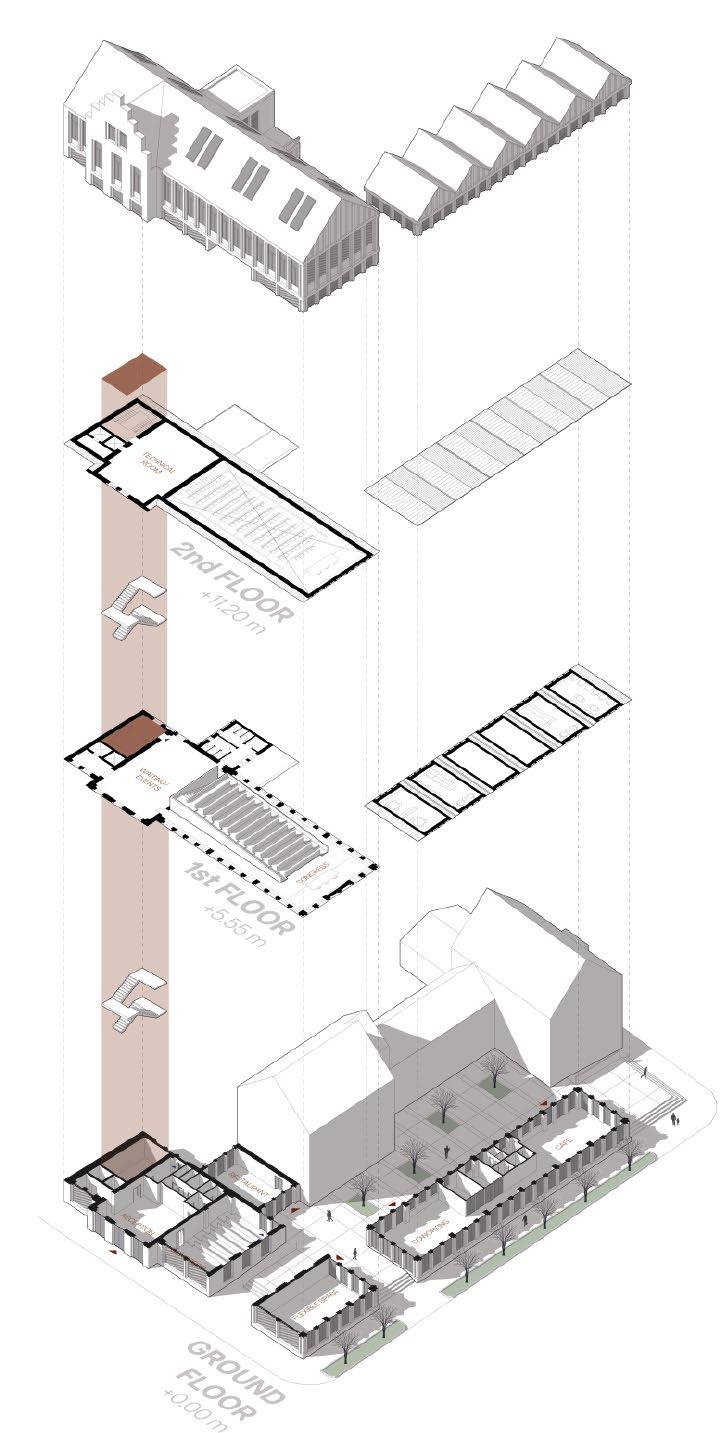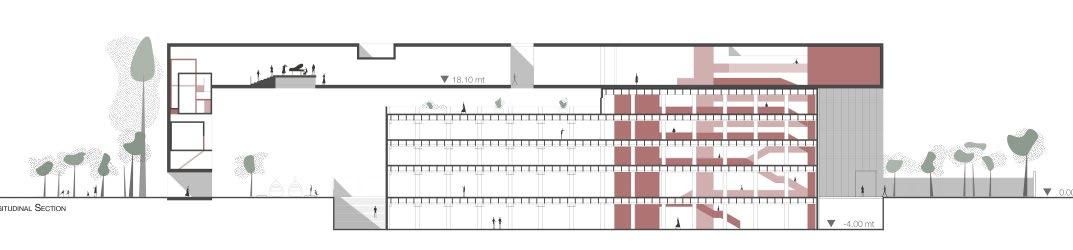 The Cittadella degli Archivi in Milan’s Nicaragua district, one of Europe’s largest archives, houses most of the city’s documents. More than a repository, it is a guardian of cultural heritage and history, deserving to be experienced as a vibrant community space. Currently enclosed by high walls, the project transforms the Cittadella into a cultural hub for public engagement. Two new volumes are introduced. The first, an L-shaped structure atop the existing building, reconnects the Cittadella to the adjacent park