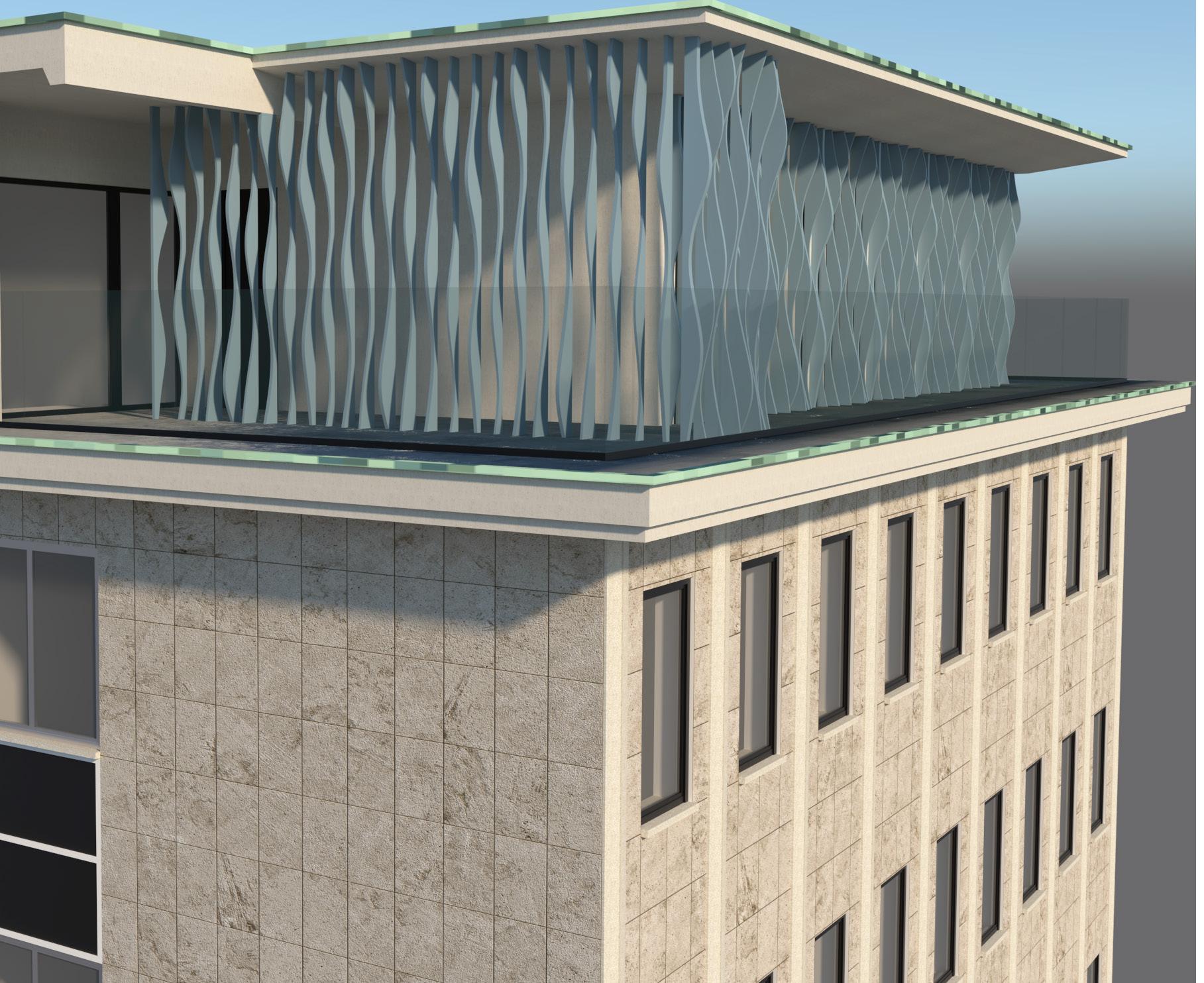 Per il decoro delle facciate l’ispirazione è stata trovata nel moto oscillatorio delle chiome degli alberi antistanti del viale, traducendosi in un sistema di lamelle ondulate poste come una seconda pelle sul corpo contenente le nuove camere.