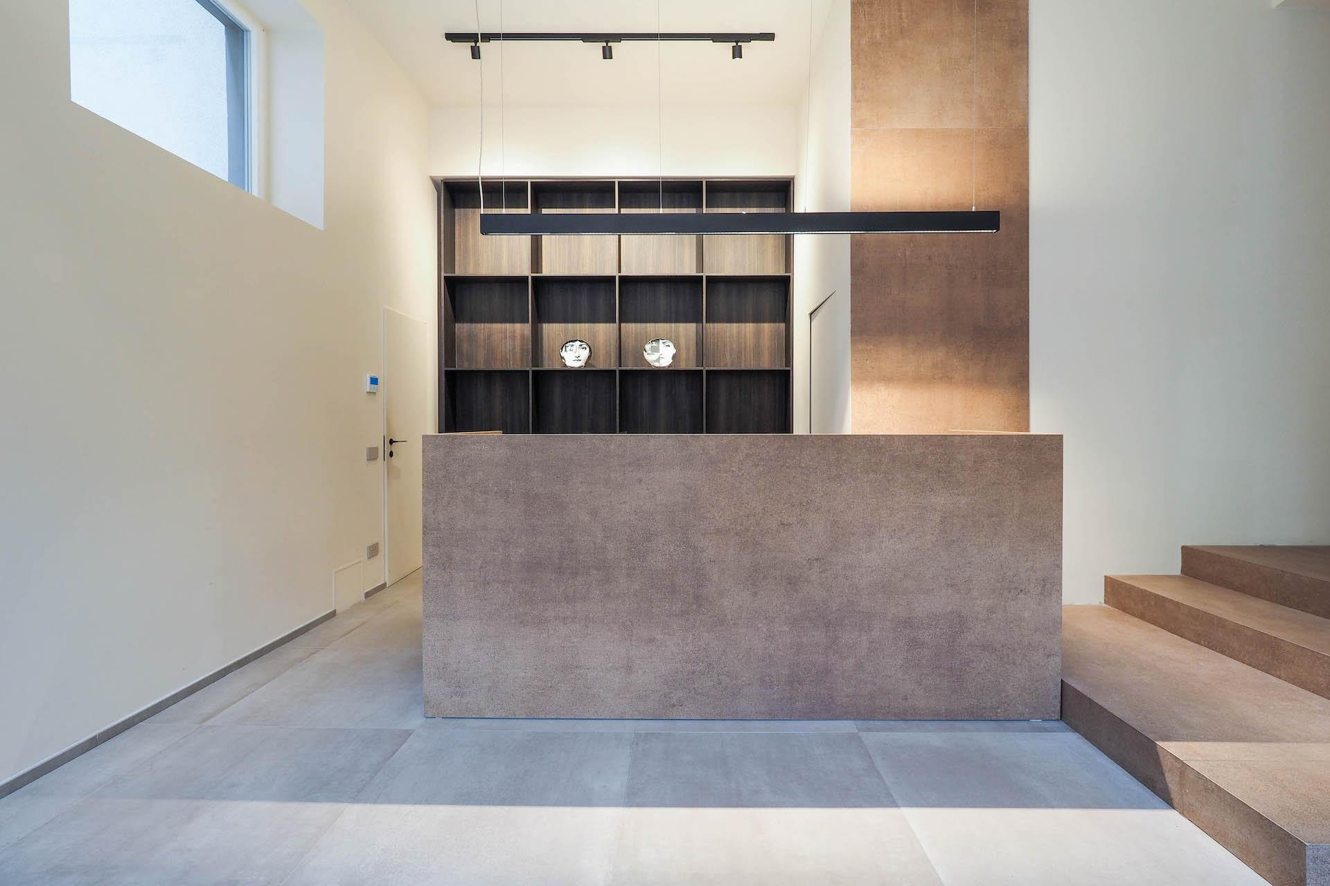 Il risultato è una totale ridistribuzione degli spazi interni, ripensati per poter ospitare un mix di funzioni diverse, showroom di arredamento, spazio polifunzionale/auditorium e studio di architettura, in perfetta simbiosi e compenetrazione.