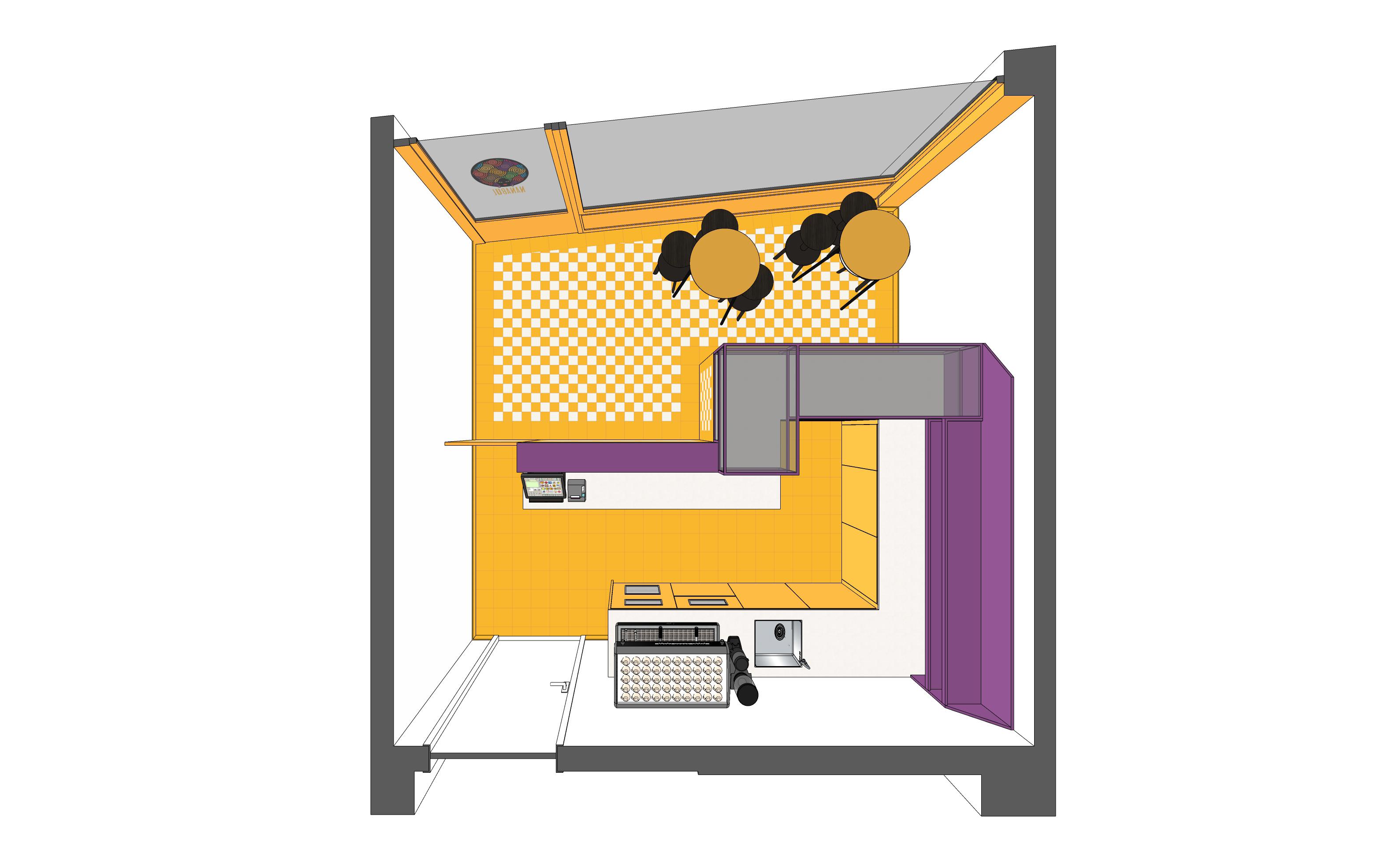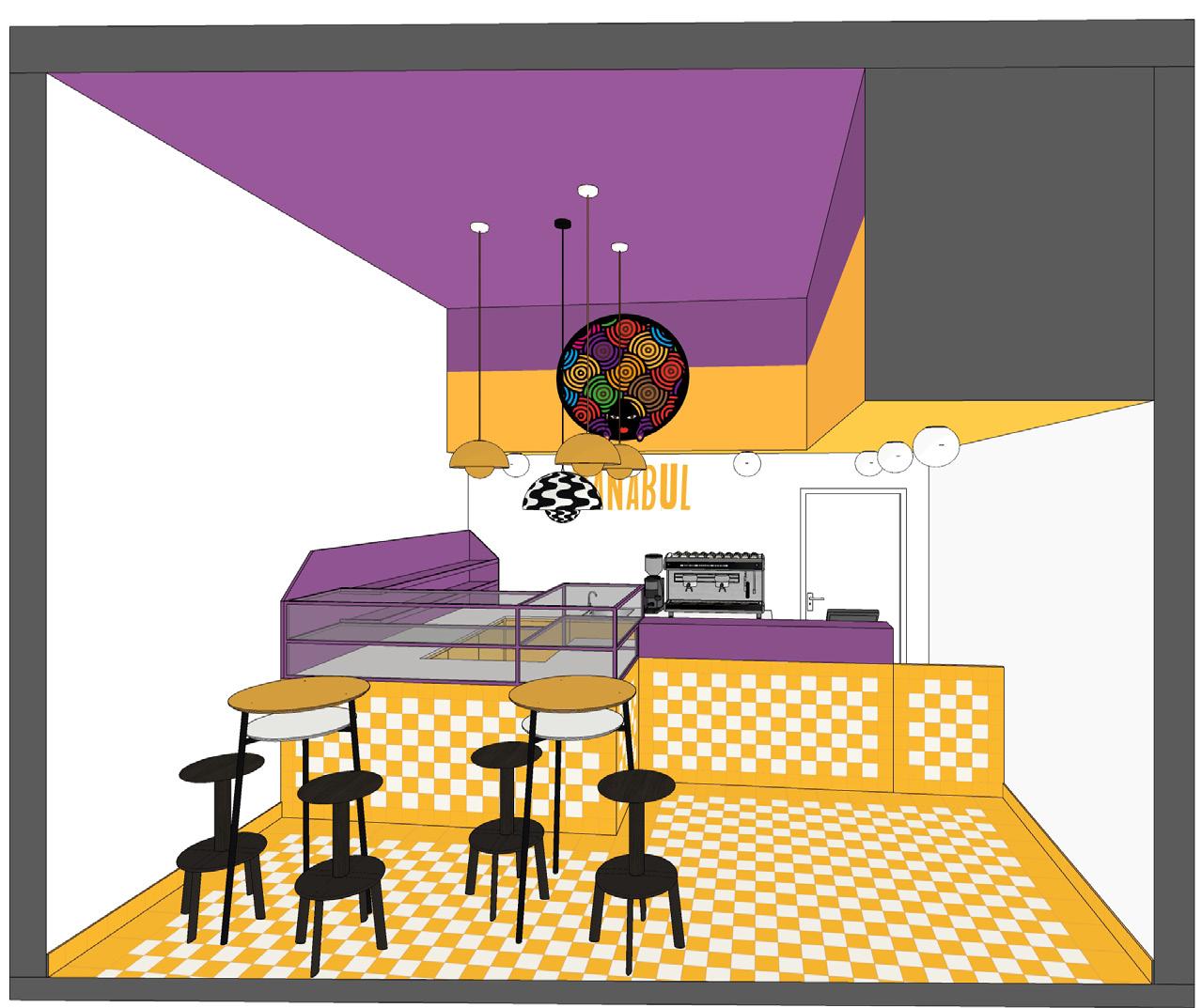 Contrasti di colore e impatto visivo sono alla base di questo progetto di ristrutturazione di un negozio in via Lario, con l’obiettivo di dare vita a un nuovo locale dallo spirito “divertente”. La pavimentazione del negozio, con un mosaico studiato ad hoc bianco e giallo con fughe viola, segue l’andamento del bancone su misura e si estende su di esso come se fosse un arazzo. A completamento del carattere giocoso e pop dell’intervento, una serie di strutture viola, funzionali all’attività commerciale, vanno ad appoggiarsi sul volume basso del bancone stesso, per un continuo rimando grafico al retrostante logo del locale.