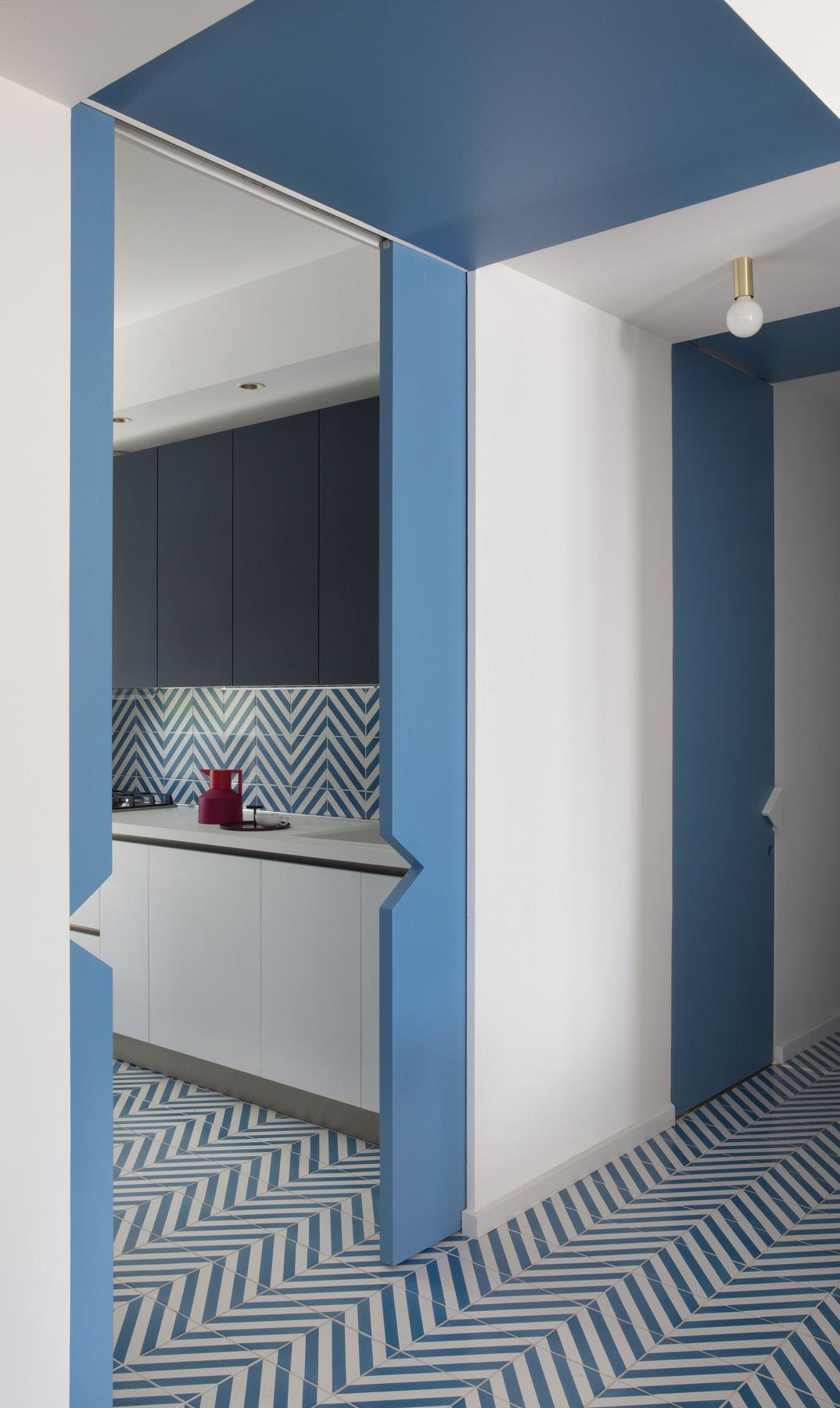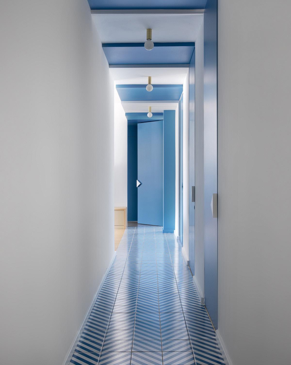Il corridoio d’ingresso,con il soffitto gradonato,le porte di accesso agli spazi privati e il disegno del pavimento, a richiamare le onde del mare, crea una promenade, giocata sulle note del blu e del bianco, che conduce verso la zona giorno.