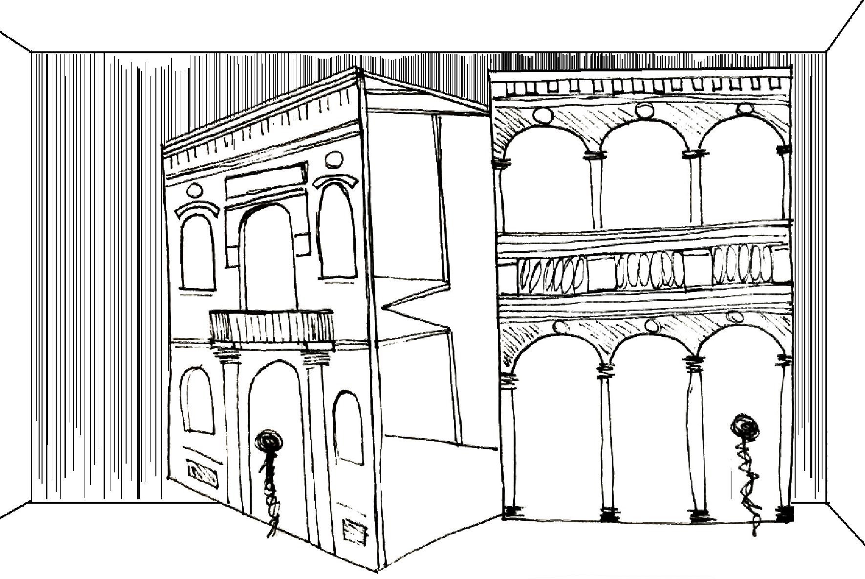 Schizzo di studio della scenografia: facciata con loggiato per il palazzo di Donna Anna; prospetto con balcone centrale per la dimora di Donna Elvira