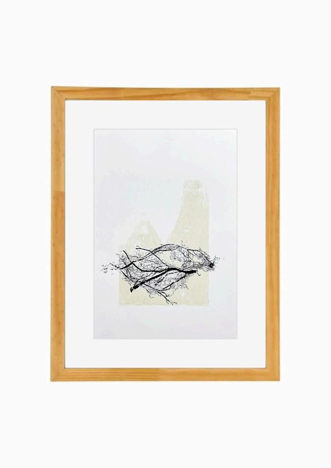 Uma possibilidade de enraizamento no horizonte que vibra em rebatimentos no corpo, Xilogravura e monotipia, 21x30cm, 2024, papel canson 200. Moldura cor natural.