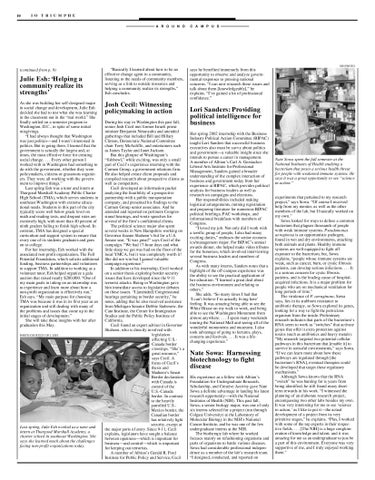 Nate Sowa spent the fall semester at the National Institutes of Health studying a bacterium that poses a serious health threat for people with weakened immune systems. He says it was a great opportunity to see “science in action.” experiments that pertained to my research project,” says Sowa. “Of course I received help from my mentor, as well as the other members of the lab, but I basically worked on my own.” Sowa looked for ways to defuse a common bacterium that plagues thousands of people with weak immune systems. Pseudomonas aeruginosa is an opportunistic pathogen, found in wet and dry environments, attacking both animals and plants. Healthy immune systems are well-equipped to fight off exposure to the bacterium, but, Sowa explains, “people whose immune systems are weak, such as cancer, burn, or cystic fibrosis patients, can develop serious infections. . . . It is a serious concern for cystic fibrosis patients, and is the leading cause of hospitalacquired infections. It is a major problem for people who are on mechanical ventilation for long periods of time.” The virulence of P. aeruginosa, Sowa says, lies in its stubborn resistance to antibiotic therapy, so Sowa explored its genes, looking for a way to fight the pernicious organism from the inside. Preliminary research indicates that parts of the bacterium’s RNA seem to work as “switches” that activate genes that offer it extra protection against toxins (such as antibiotics and heavy metals). “My research targeted two potential cellular pathways in this bacterium that [enable it] to survive in stressful environments,” says Sowa. “If we can learn more about how these pathways are regulated through [the bacterium’s RNA], eventual therapies could be developed that target these regulatory mechanisms.” Although Sowa knows that the RNA “switch” he was hunting for is years from being identified, he still found many shortterm rewards in his work. “I witnessed the planning of an elaborate research project, encompassing two other labs besides my own. It was very interesting for me to see ‘science in action,’ as I like to put it—the actual development of a project from its very primitive stages,” he explains. “Plus, I worked with some of the top experts in their respective fields. . . . [The NIH] is a huge conglomeration of knowledge and talent, and it was amazing for me as an undergraduate to just be a part of this environment. Everyone was very supportive of me, and I truly enjoyed working there.”