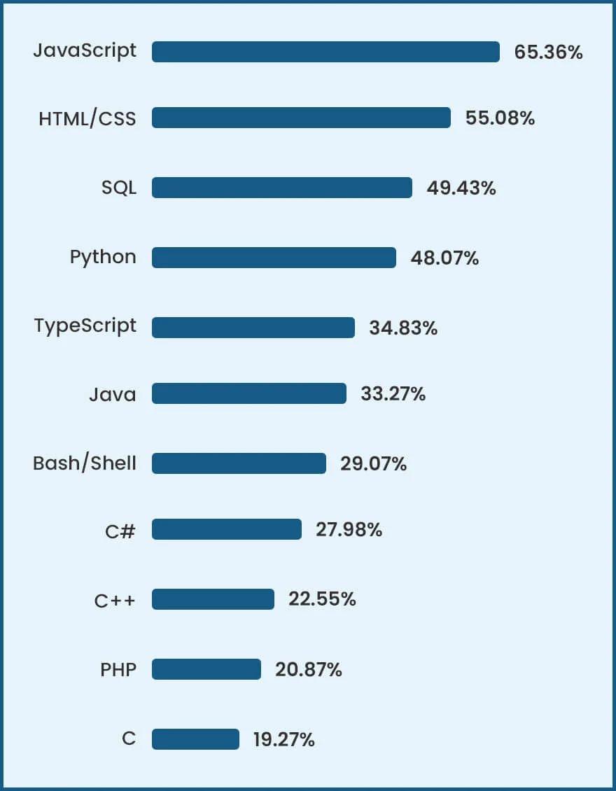 Your application will be made using code written in a programming language like JavaScript, PHP, or Python. Programming languages handle the crucial business logic required by your apps. JavaScript, TypeScript, Java, Python, Ruby, Scala, PHP, and C# are a few popular computer languages.