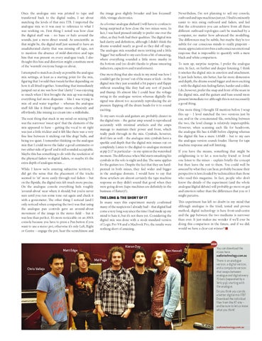the image goes slightly broader and less focussed! Ahh, vintage electronics. As a former analogue diehard I will have to confess to being surprised at how close the two mixes were. In fact, I was hard pressed initially to prefer one over the other, as they both had their qualities. The digital mix had clarity and definition, although I didn’t think the drums sounded nearly as good as they did off tape. The analogue mix sounded more inviting and a little ‘bigger’ but suffered to my ears from a bit of smearing, where everything sounded a little more mushy in the bottom end (no doubt thanks to phase-smearing inductors, capacitors and transformers). One more thing that also stuck in my mind was how I couldn’t get the ‘power’ out of the snare or kick – in the digital mix they just sounded a bit papery and flappy without sounding like they had any sort of punch and thump. It’s almost like I could hear the voltage swing in the analogue version whereas digitally the signal was almost too accurately reproducing the air pressure flapping off the drum heads for it to sound exciting. To my ears vocals and guitars are probably clearer in the digital mix – the guitar amp sound is reproduced accurately with minimal artefacts and the amps manage to maintain their power and front, which really push through in the mix. Cymbals, however, don’t fare as well – the analogue mix cymbals have a sparkle and depth that the digital mix misses out on completely. Listen to the digital-to-analogue moment at pip 2:17 in particular – in my opinion the watershed moment. The difference when Mal starts smashing his cymbals in the solo is night and day. The same applies for the guitars too. Despite the fact that they are hardpanned in both mixes, they feel wider and bigger in the analogue domain. I would have to say that those artefacts are almost certainly the tape machine response as they didn’t sound that good when they were going down (tape machines are definitely in the business of flattery!). THE LONG & THE SHORT OF IT In many ways this experiment merely confirmed many of the suspicions I already had – that digital had come a very long way since the time I had made up my mind to hate it, but it’s not there yet. Considering the digital mix was done with a stock-standard version of Logic Pro V8 and a Macbook Pro, the results were nothing short of amazing.