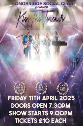 Longbridge Social Club welcome Abba tribute band Kiss The Teacher in April Members of Longbridge Social Club in Birmingham will be enjoying some top Abba tunes on Friday, April 11 as tribute act Kiss The Teacher perform on the club’s stage. The four-piece band were Tribute Act Of The Year Award Winnners in 2022.