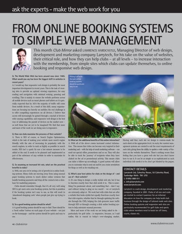 FROM ONLINE BOOKING SYSTEMS TO SIMPLE WEB MANAGEMENT This month Club Mirror asked LAWRENCE HARDCASTLE, Managing Director of web design, development and marketing company Larrytech, for his take on the value of websites, their critical role, and how they can help clubs – at all levels – to increase interaction with the membership, from simple sites which clubs can update themselves, to online booking and responsive web design. Q. The World Wide Web has been around now since 1989. What would you say has been the biggest shift in websites in recent years? A. I would say that responsive web design is probably the most important development in recent years. This is the task of creating sites to provide an optimal viewing experience, for easy reading and navigation with minimal resizing, panning and scrolling. This is mainly to ensure the website performs across all mobile devices such as smart phones and tablets as it is generally expected that by 2015 the majority of traffic will come from mobile devices. As a result of this shift, many organisations are focusing too heavily on mobiles; the real challenge is to offer compelling experiences on all devices. I believe that access will increasingly be gained through a myriad of devices with varying capabilities, and responsive web design is the best way of addressing the parade of devices on the market now – as well those that are yet to be imagined! We find that more and more of the work we are doing now is responsive. Q. How can clubs maximise the presence of their website? A. There is SEO of course, or Search Engine Optimisation, which is the task of making your website more search engine friendly with the aim of increasing its popularity with the search engines, in order to rank as highly as possible in search results. SEO isn’t a quick fix nor a last minute measure to be added at the end. It needs to be planned and implemented as part of the substance of any website in order to maximise its effectiveness. Q. So assuming an increased hit rate, what are the practical benefits to clubs? A. Well, one area we’re seeing a lot of growth in is online booking systems. Many clubs are moving away from using manual paper booking systems to much slicker online versions that handle booking payments and drop all the contacts into a database for marketing purposes. Clubs should remember though, that it’s all very well using SEO to get users onto your booking system, but this is pointless if the booking system isn’t easy to use, as this will result in ‘abandoned shopping carts’ when people just give up trying to book. Q. So a good booking system should be what? A A good booking system should be easy to find. There should be a ‘book online’ button on each page of your website - not just on the homepage - and the system should be quick and easy to use.