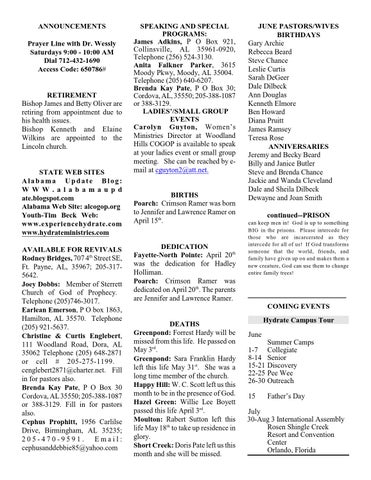 STATE WEB SITES Alabama Update Blog: WWW.al ab a ma u p d ate.blogspot.com Alabama Web Site: alcogop.org Youth-Tim Beck Web: www.experiencehydrate.com www.hydrateministries.com AVAILABLE FOR REVIVALS Rodney Bridges, 707 4th Street SE, Ft. Payne, AL, 35967; 205-3175642. Joey Dobbs: Member of Sterrett Church of God of Prophecy. Telephone (205)746-3017. Earlean Emerson, P O box 1863, Hamilton, AL 35570. Telephone (205) 921-5637. Christine & Curtis Englebert, 111 Woodland Road, Dora, AL 35062 Telephone (205) 648-2871 or cell # 205-275-1199. cenglebert2871@charter.net. Fill in for pastors also. Brenda Kay Pate, P O Box 30 Cordova, AL 35550; 205-388-1087 or 388-3129. Fill in for pastors also. Cephus Prophitt, 1956 Carlilse Drive, Birmingham, AL 35235; 205-470-9591. Email: cephusanddebbie85@yahoo.com