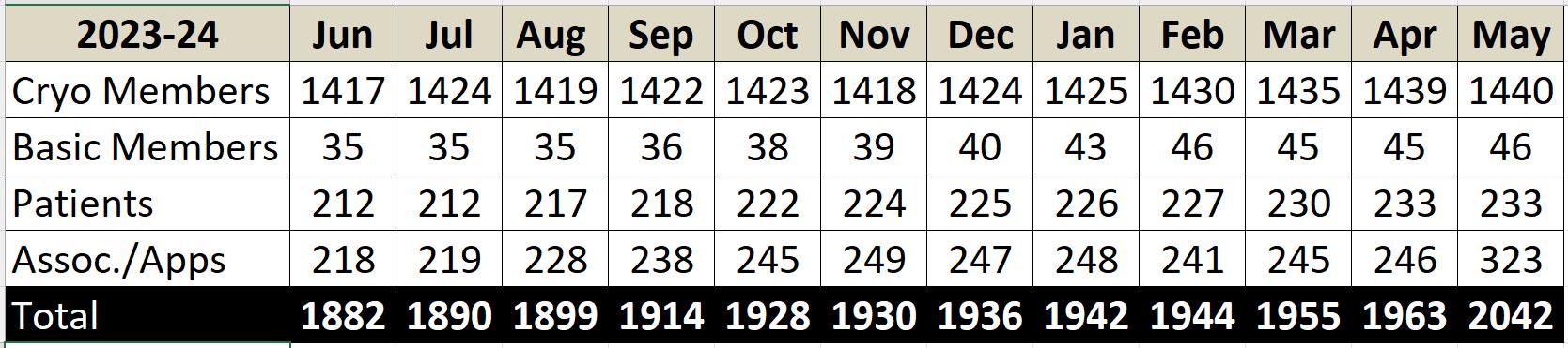 How many members, associate members, and patients does Alcor have? Monthly totals covering past year.