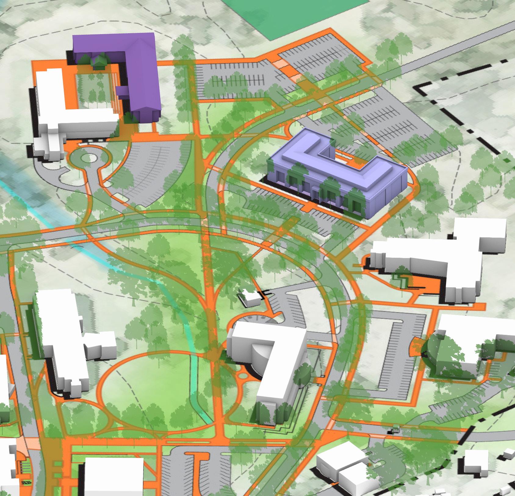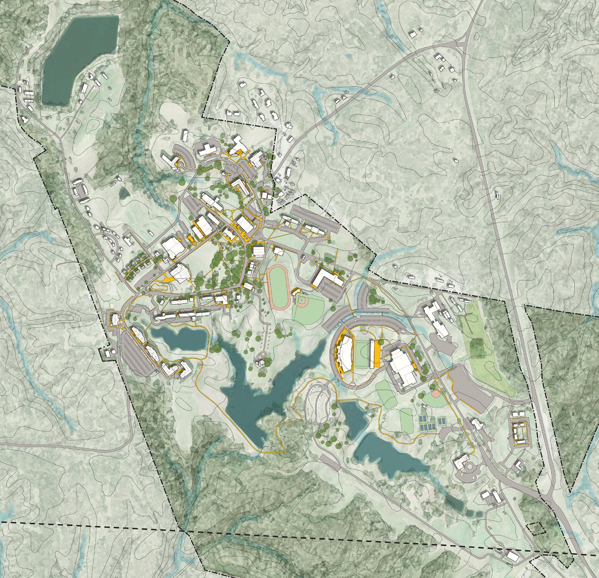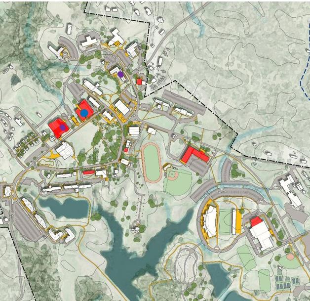 • Addition of student housing, faculty and staff housing, and academic buildings for future enrollment and program needs, accompanied by a relocation of the existing Facilities Management Building to enable improved definition of the Core North neighborhood as a center of academic programming.