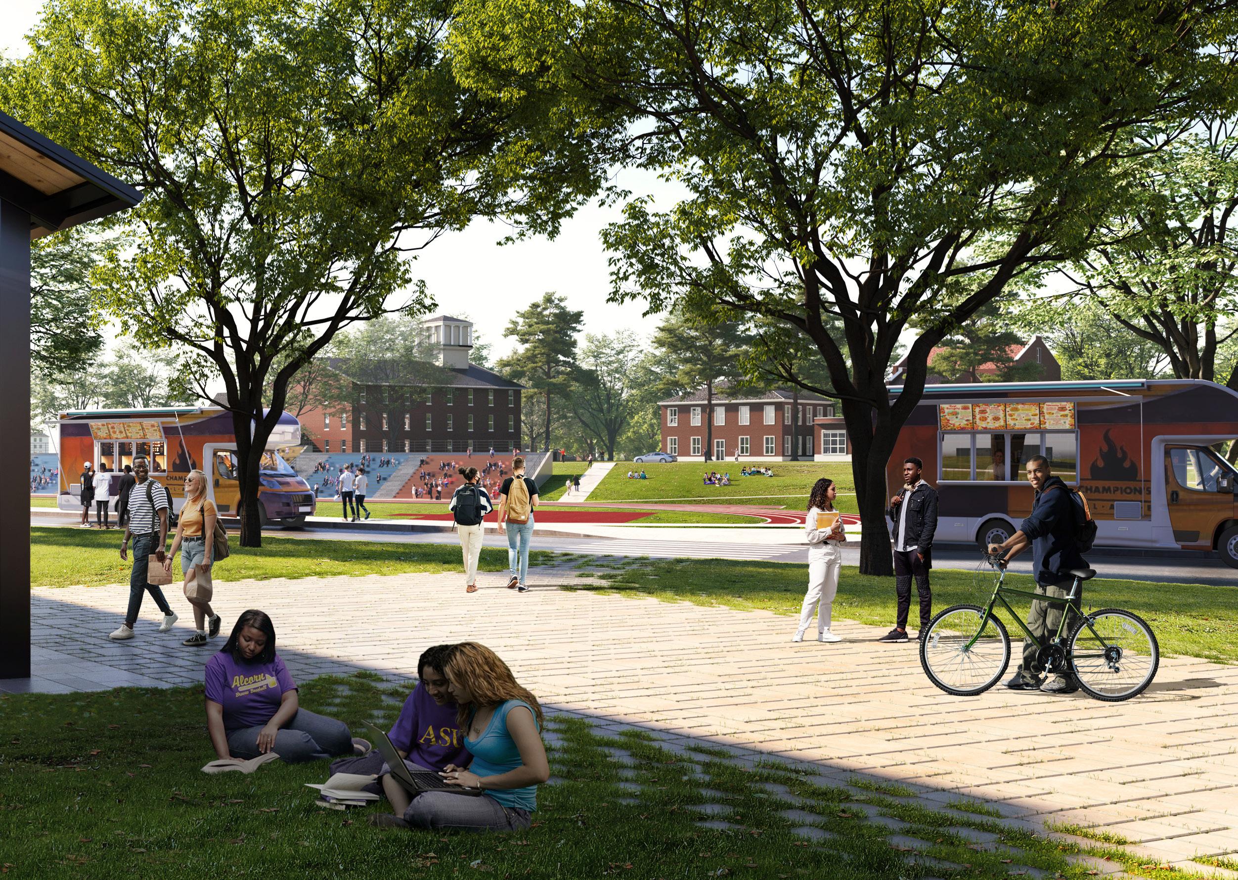 • The Yard, with an enhanced landscape, new shade trees, a dining terrace, a central event pavilion, and Alcorn Avenue pedestrianization trials, as well as a renovation to the Library