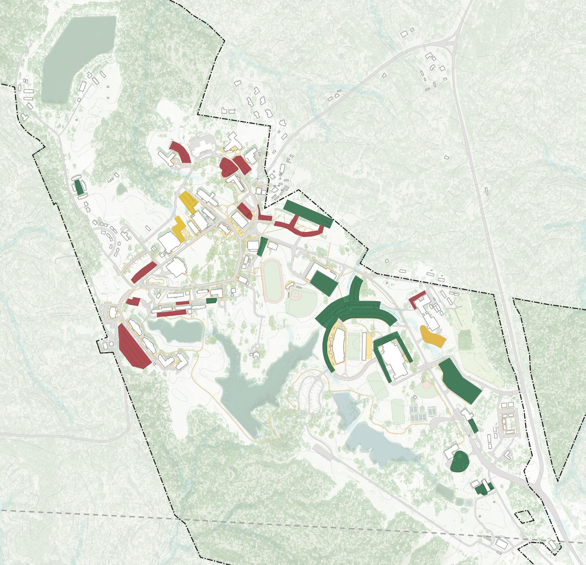 The campus plan supports this strategy with an inventory of proposed capital investments, linked to initial prioritization and phasing recommendations to guide the timing of their implementation. For the ten-year plan, there are two main phases: near-term priorities, and the remainder of the ten year plan.