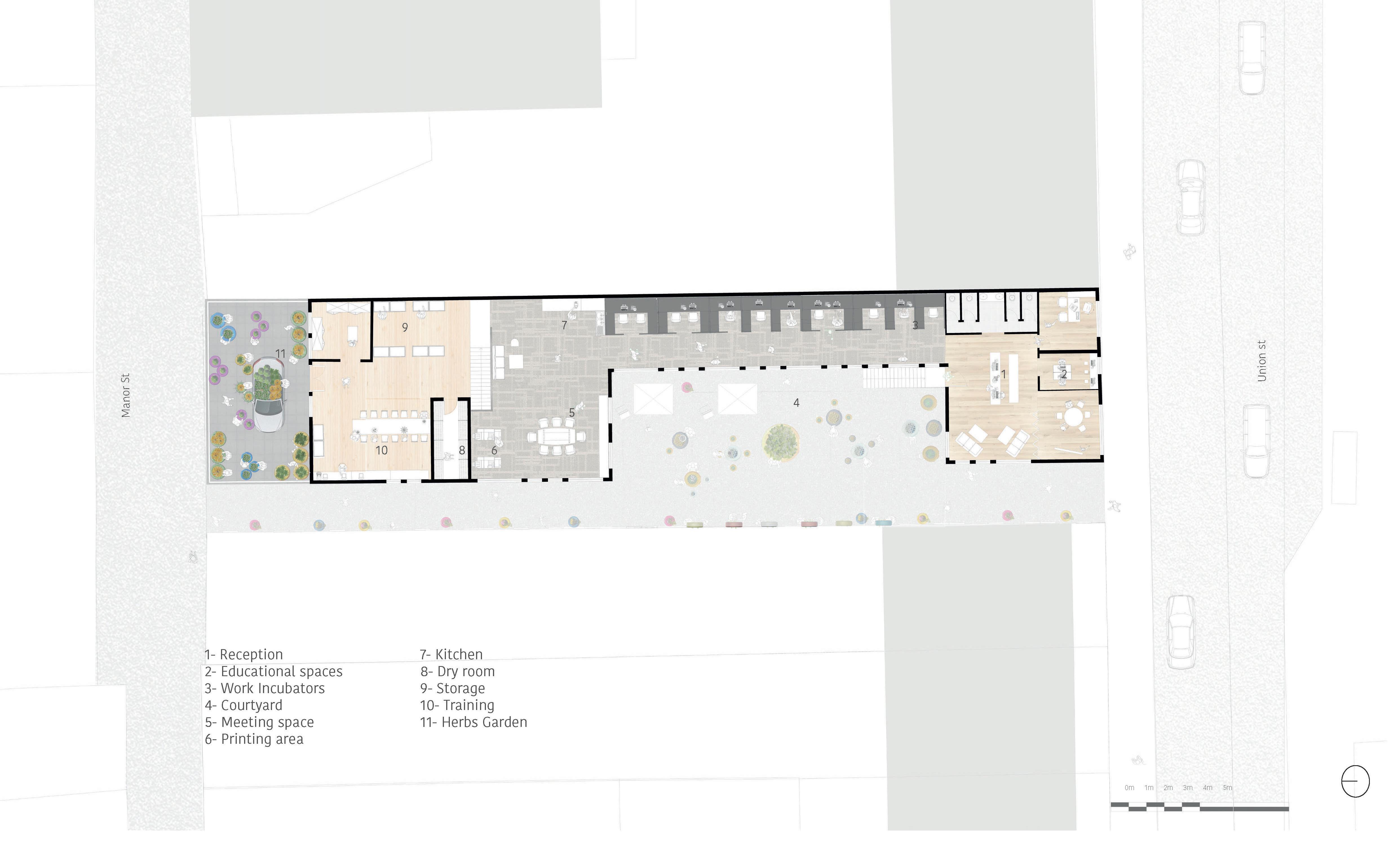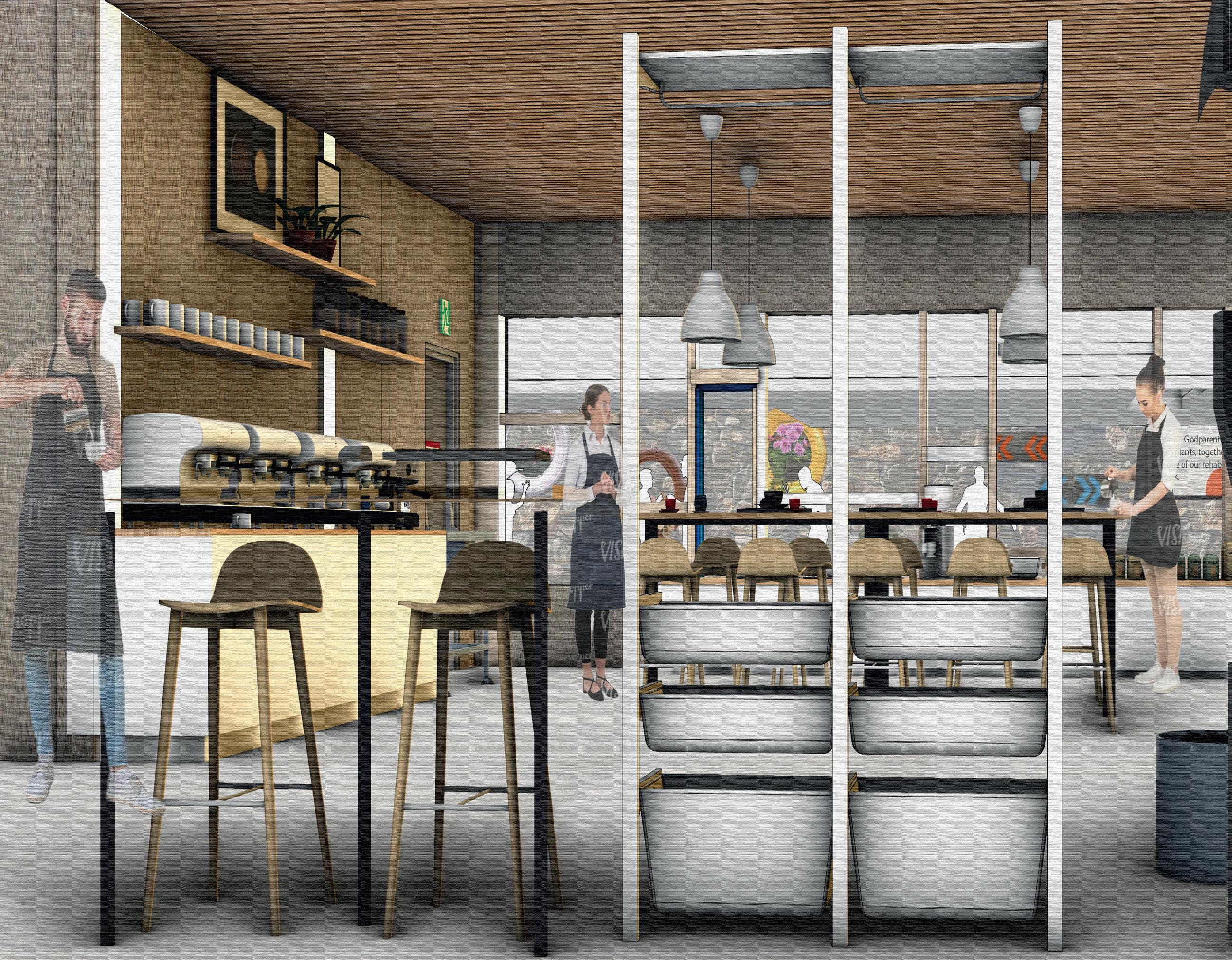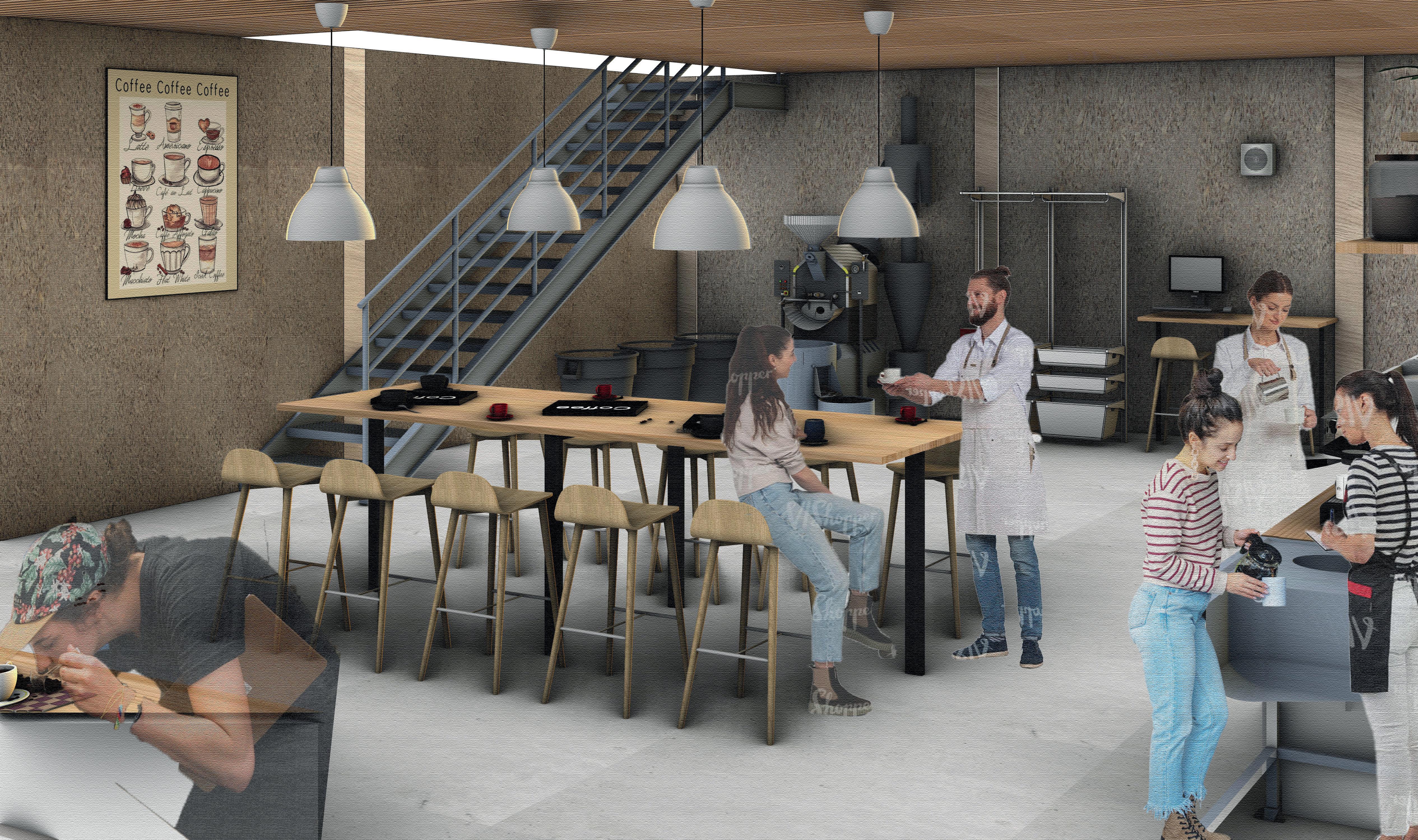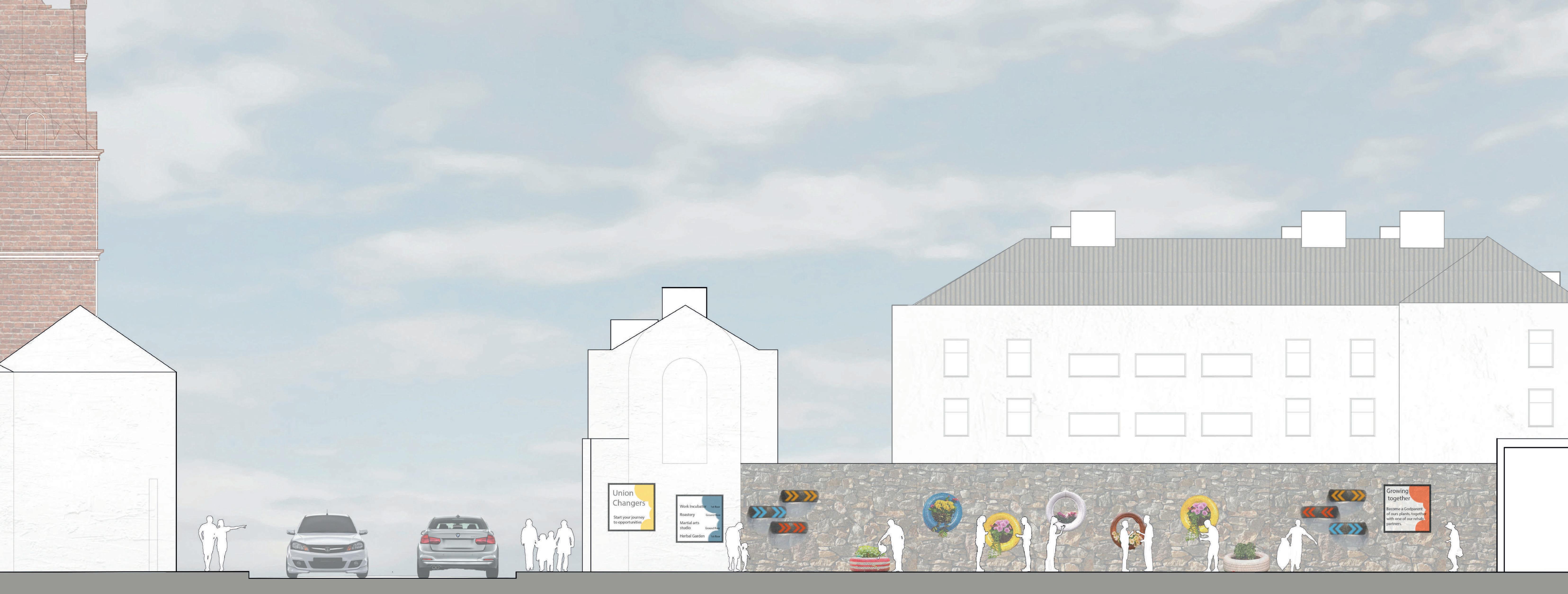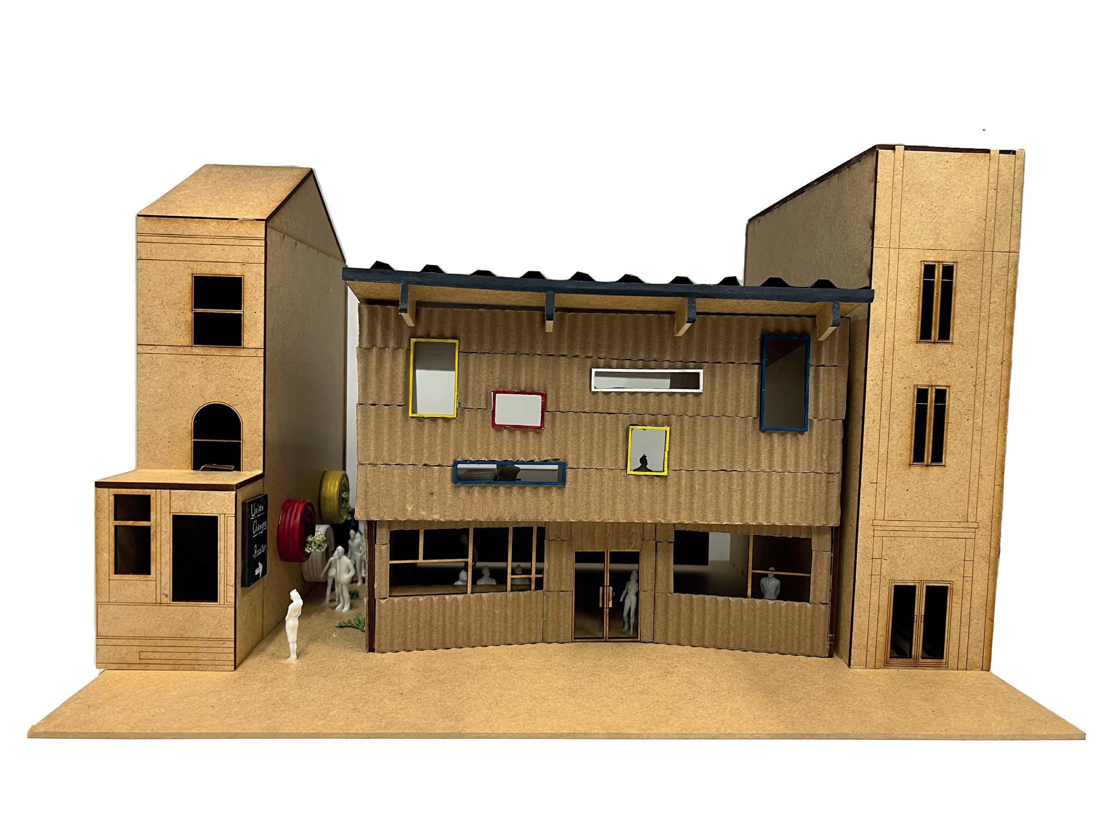 CIVIC CENTRES FEB - APR 2022 A community centre that focus on the social reintegration of other members of our society. A roastery, martial arts centre, co- working space and herbal garden provide the training and work opportunity that will be the catalyst of social change. CLIENT: NUDGE COMMUNITY BUILDERS LOCATION: UNION STREET, PLYMOUTH TYPE: PERMANENT CORE CONCEPTS UNION CHANGERS Connecting outdoor and indoor Visual Impact Repurpose the cars parts of the existing garage ELEVATIONS [Original scale 1:100] VIEW INSIDE THE ROASTERY