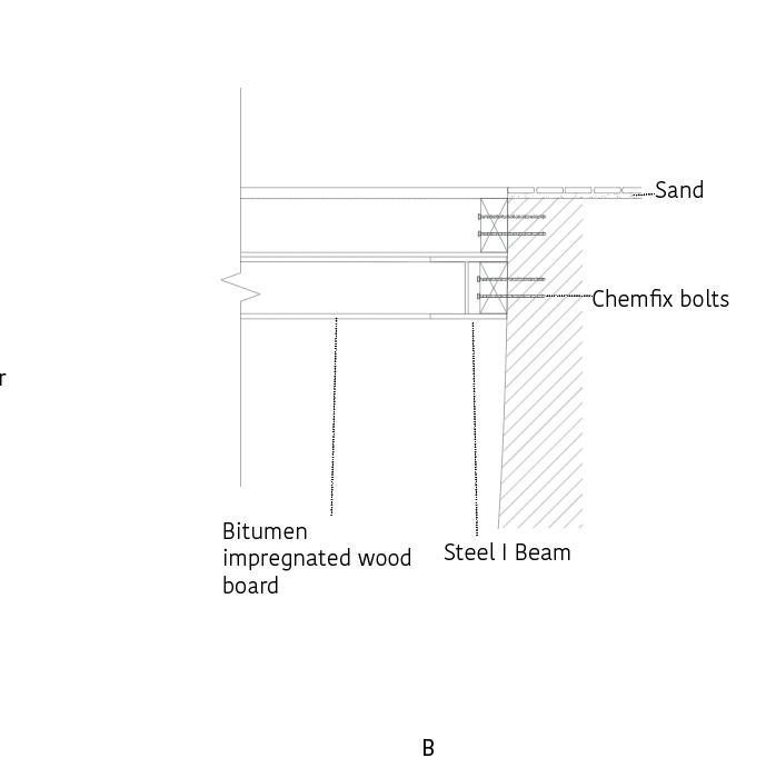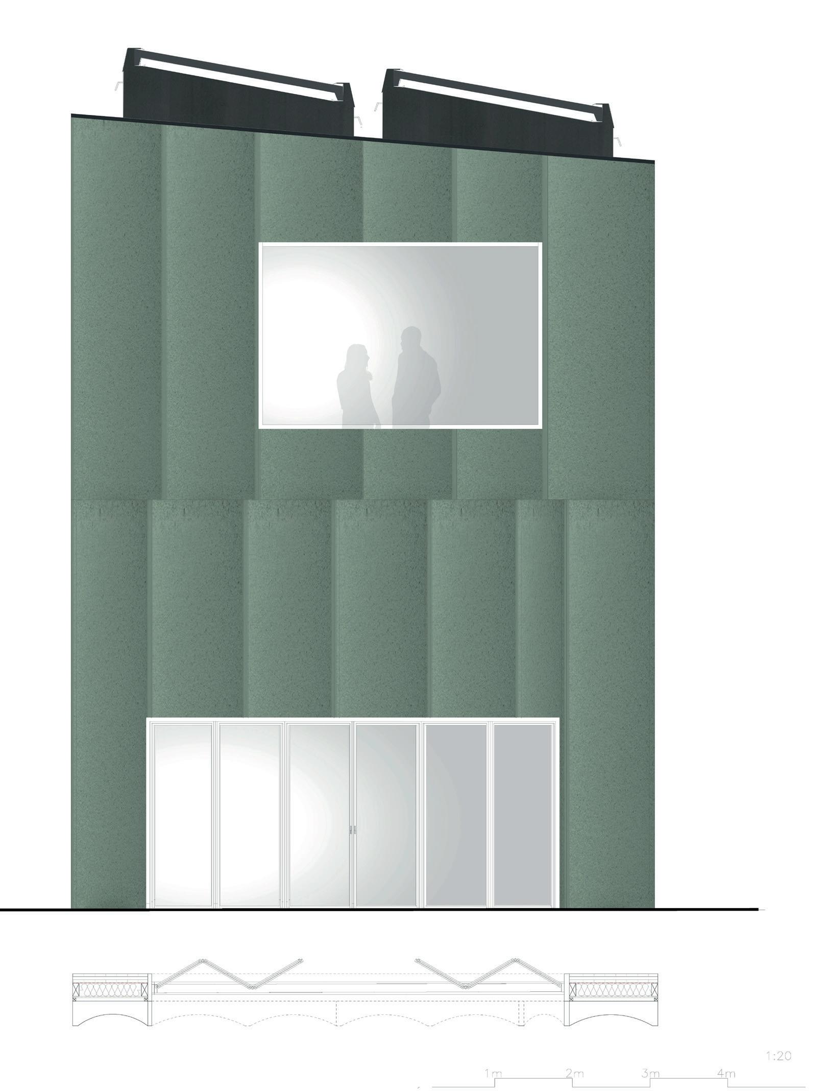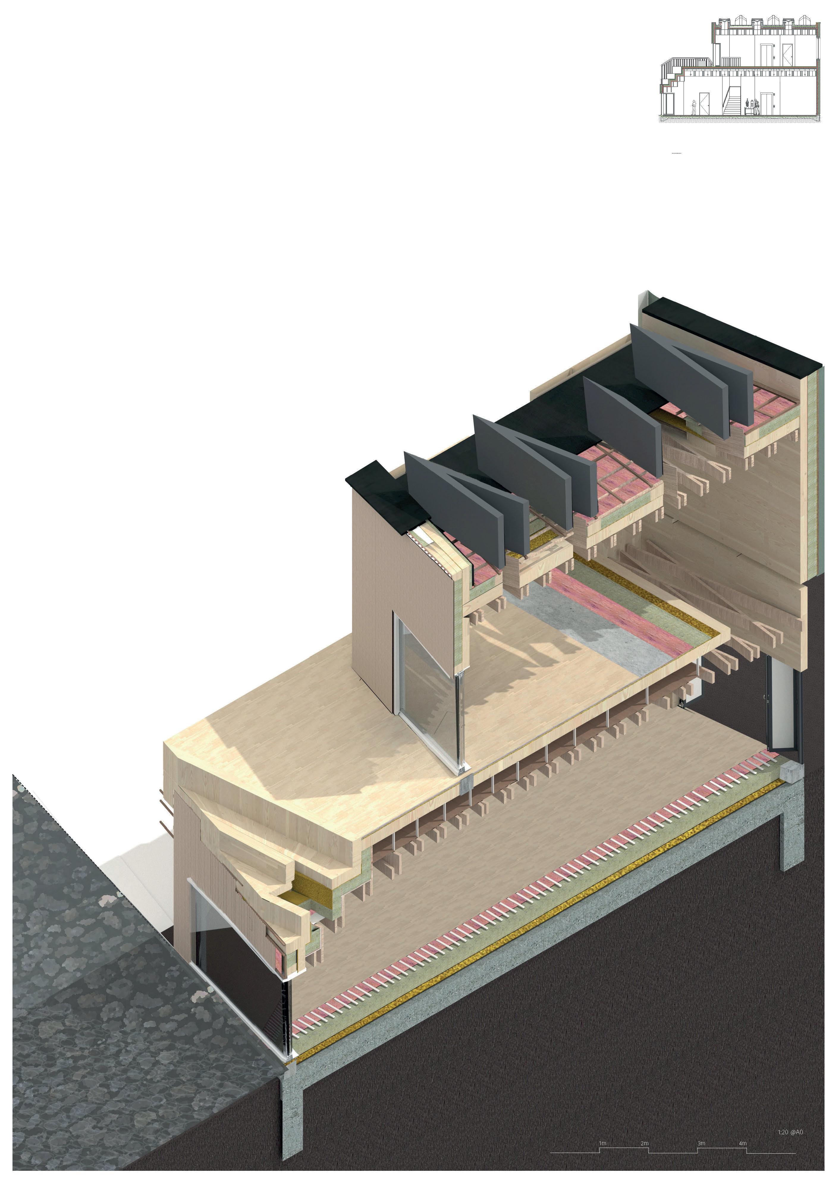 CREEKSIDE UPCYCLING MUSEUM AND FACTORY ADALGISA CASSUENDE ARCHITECTURE PORTFOLIO CONSTRUCTION DETAIL [Original scale 1:20] CLT Ceiling assembly: top > bot 15 mm Timber 55mm Screed Wood-based panel (vapour-tight), 12mm 25 mm Acoustic insulation Bitumen impregnated wood fibre insulating board, 18mm airtight) 150 mm CLT structural floor plan Suspended ceiling for service fire sprinkler and lighting) 40 x 300mm Lvl panel forming waffle ceiling CLT Wall assembly: int > ext 100 mm CLT structural wall panel with exposed internal finish Wood-based panel (vapour-tight), 12mm Insulation between frame: stud, 75 150 mm Bitumen impregnated wood fibre insulating board, 18mm airtight) Vertical timber battens, ventilation cavity, 40mm Recycled plastic facade structure R - value 3.4 30\30\30 fire rating inside 90\90\90 outside CLT Foundation assembly: top > bot 15 mm Timber Underfloor heating Wood-based panel (vapour-tight), 12mm Insulation between bottom frame, 75 x 150 mm Bitumen impregnated wood fibre insulating board, 18mm airtight) Concrete foundation slab with base insulating 225 mm deep pre-cast concrete threshold wrapped in dpc Vented drainage channel Paving CLT Stepped ceiling assembly: ext > int 100 mm CLT structural wall panel with exposed internal finish Bitumen impregnated wood fibre insulating board, 18mm airtight) 150 mm Rigid insulation Wood-based panel (vapour-tight), 12mm 40 x 300mm Lvl panel forming waffle ceiling Double height Lvl panel CLT Roof assembly: top > bot PVC roof light with rigid insulation Double trocal roofing Roof batterns on counterbattens 3-ply waterproofing breather layer, waterproofing plus uv protection layer 150 mm Insulation Bitumen impregnated wood fibre insulating board, 18mm airtight) 150mm CLT structural roof panel 40 x 300mm Lvl panel forming waffle ceiling R- value 5.9 60\60\60 fire rating CLT Wall assembly: int > ext 100 mm CLT structural wall panel with exposed internal finish Wood-based panel (vapour-tight), 12mm Insulation between frame: stud, 75 x 150 mm Bitumen impregnated wood fibre insulating board, 18mm airtight) Vertical timber counter battens, ventilation cavity, 40mm Horizontal timber battens 25mm x 50mm Vertical timber cladding R - value 3.4 30\30\30 fire rating inside 90\90\90 outside Construction Detail