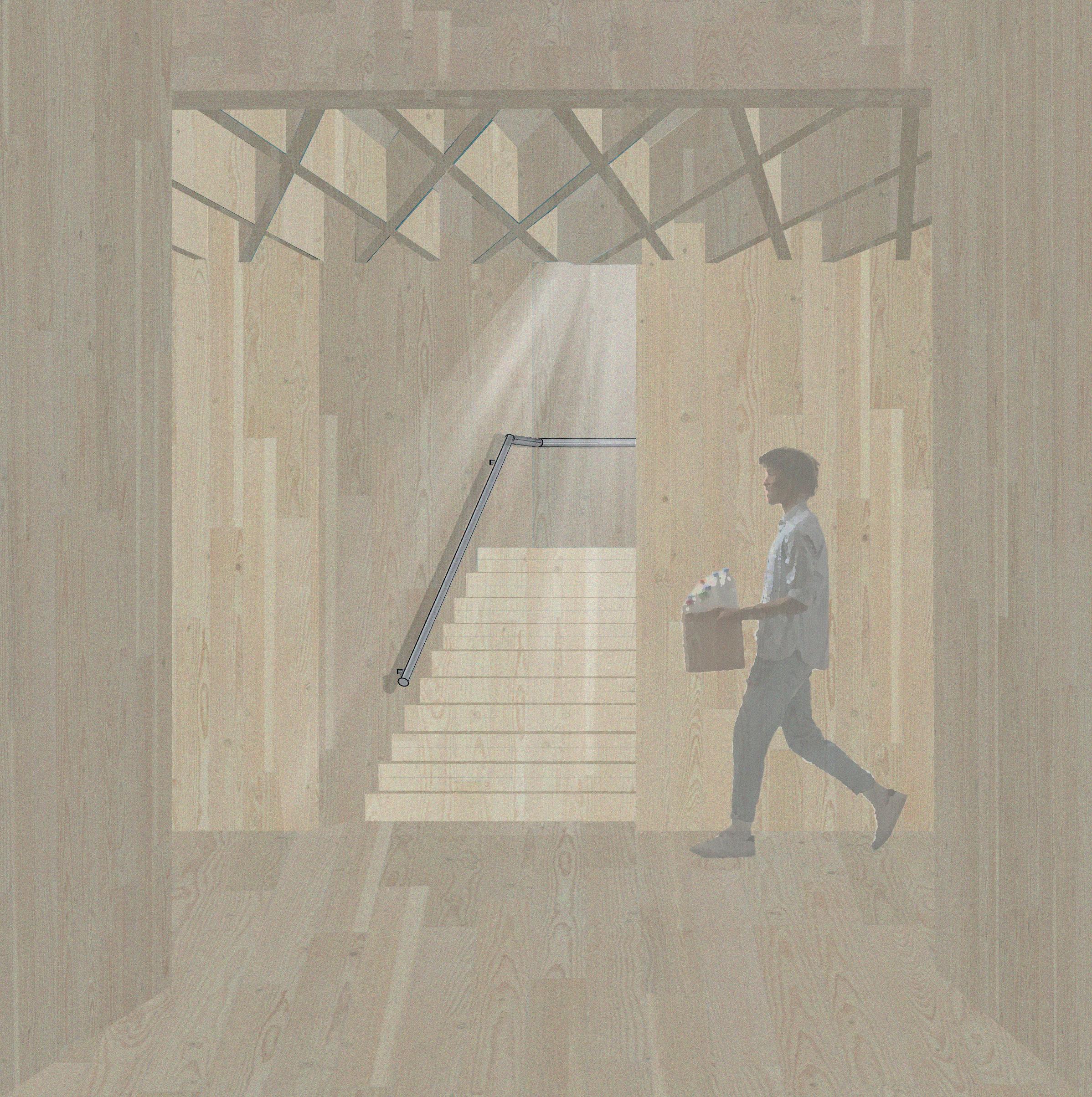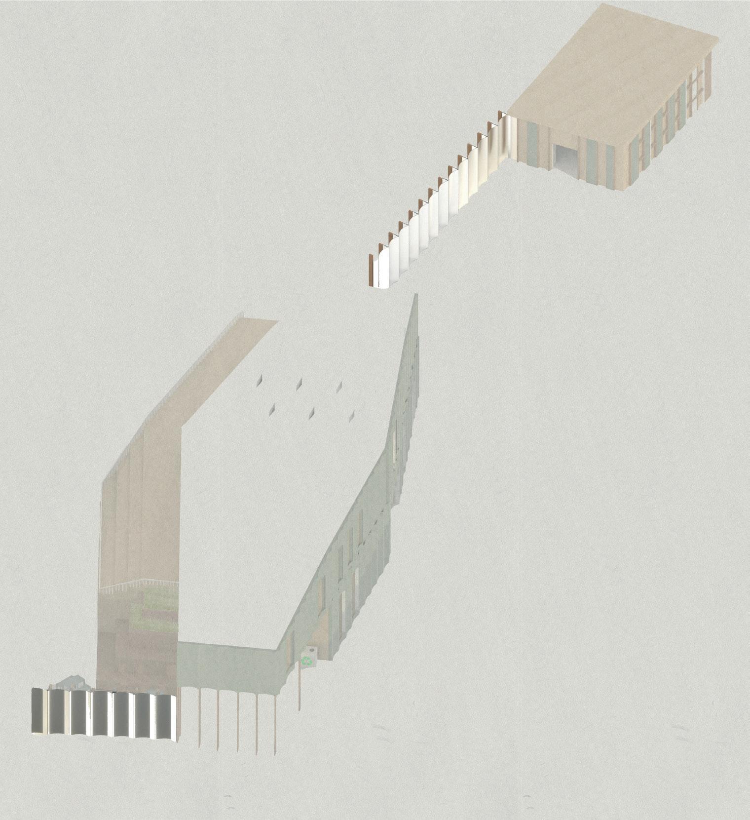 Each panel up to 2000 mm long, having some of them shorter to fit the building grid. Primary Structure Primary Structure Primary Structure Primary Structure Secondary Structure Secondary Structure Tertiary Structure Secondary Structure Laminated veneer lumber (LVL) Cross laminated timber (CLT) For the structural walls and floor. Because it is a prefabricated panel, CLT is a fast method of construction and environmentally sustainable, being able to provide 15-26% reduction in global warming potential, depending on the building design. Fire resistance CLT structure could withstand more than 90 minutes of burning before it collapsed. For the exposed beams running along the ceiling. An ideal solution for the strength and dimensional stablity that is needed for the ceiling whilst allowing slim, elegant construction/aesthetic. LVL panels as ceiling elements. LVL panels supporting the stepped ceiling. LVL panels supporting the pitched roof. Exposed CLT on the inside Fire rate inside 30/30/30 Elevation This facade module will be applied only to one side of the building. @1:50 Understanding the assembly of Nottingham Comtemporary facade. assembly Recycled plastic facade structure Airtight Insulation between timber frame Vapour membrane Timber battens for the assembly of the facade. Exposed CLT on the inside Fire rate inside 30/30/30 Fire rate outside 60/60/60 Elevation This facade module will be applied only to one side of the building. @1:50 Understanding the assembly of Nottingham Comtemporary facade. RECYCLED FROM PROJECT 1 RECYCLED PLASTIC CONSTRUCTION MATERIAL WHAT CAN BE REUSED PROJECT LIFECYCLE A 50 cm of the module is 3.3kg of collected material. The recycled plastic waste is melted and poured into a mould. Material & Structure