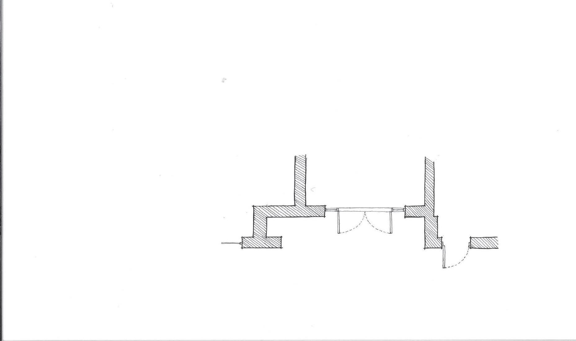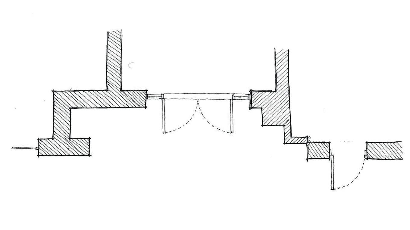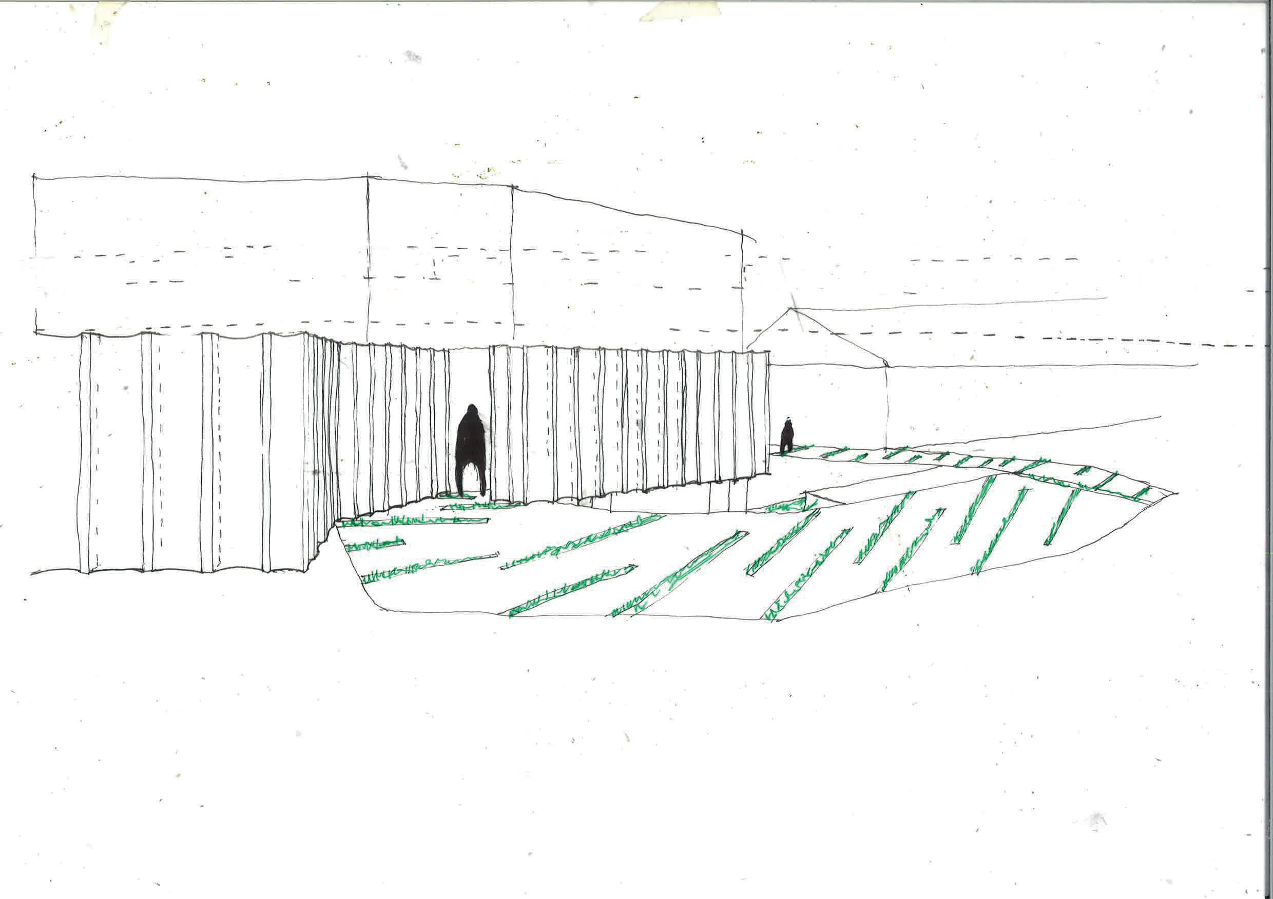 CREEKSIDE UPCYCLING CENTRE VIEW FROM THE ENTRANCE LOOKING INSIDE THE BUILDING INITIAL SKETCH A B C c B A