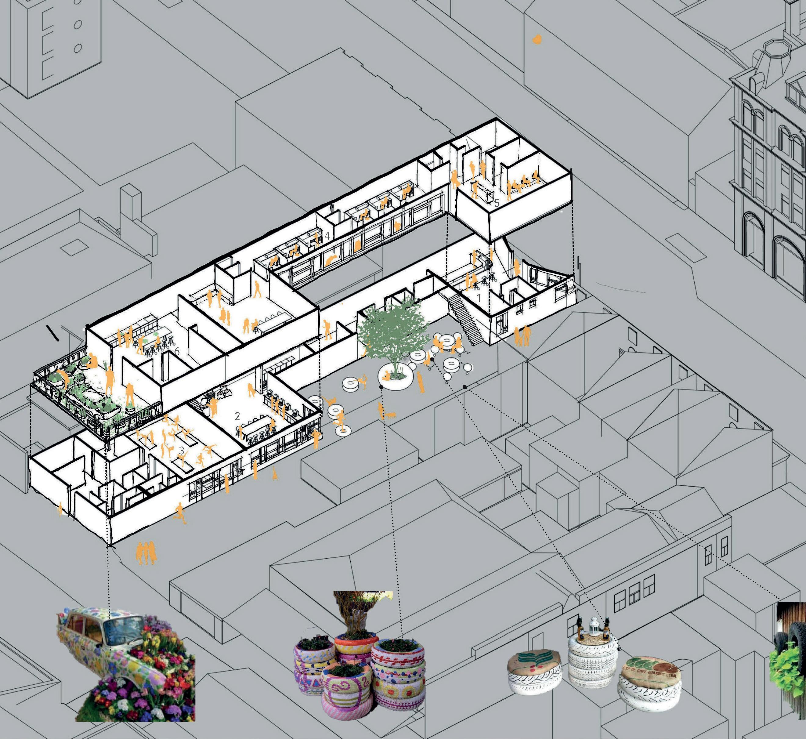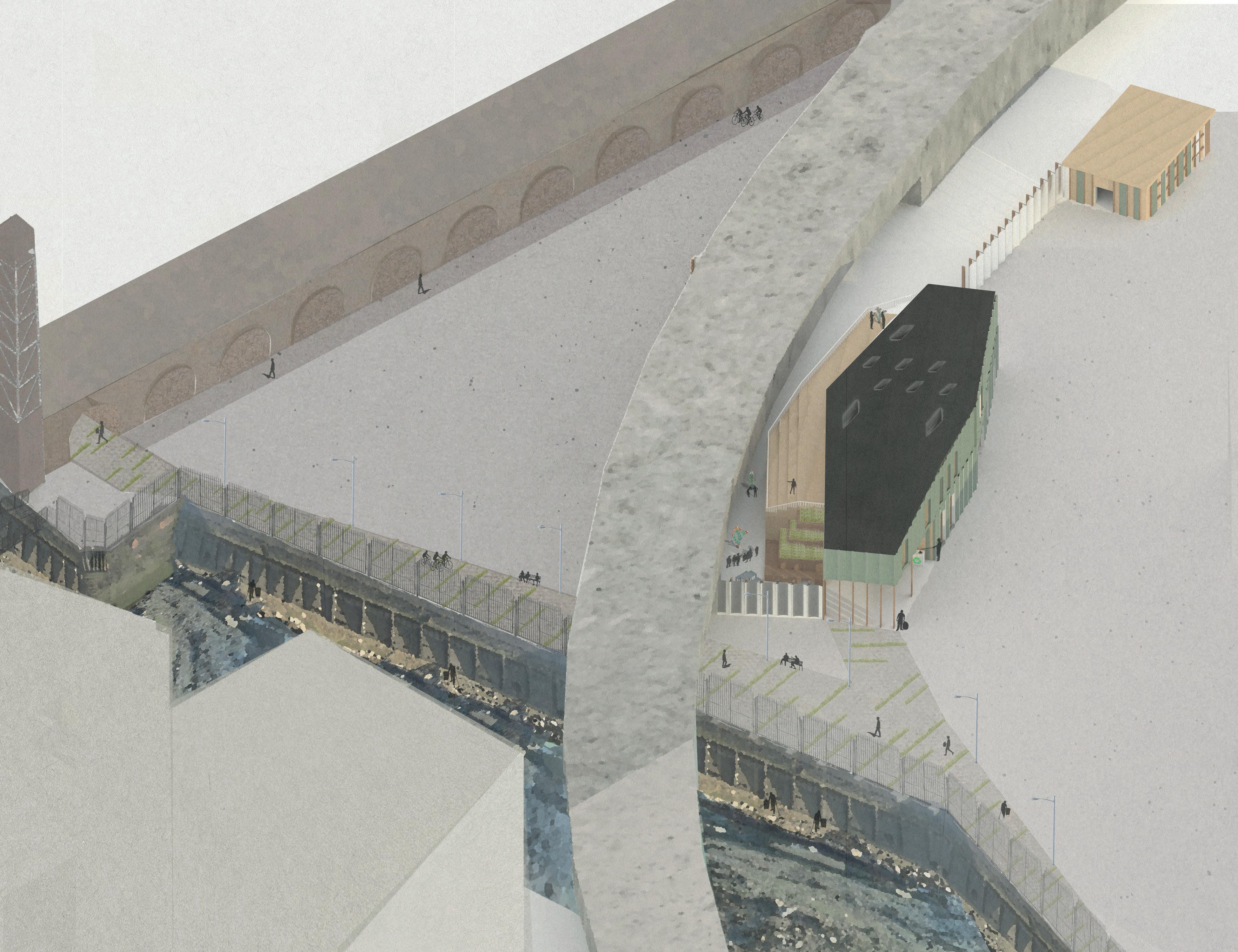 INITIAL SKETCH CONCEPTUAL COLLAGE ADALGISA CASSUENDE ARCHITECTURE PORTFOLIO CREEKSIDE UPCYCLING MUSEUM AND FACTORY Landscape Proposal