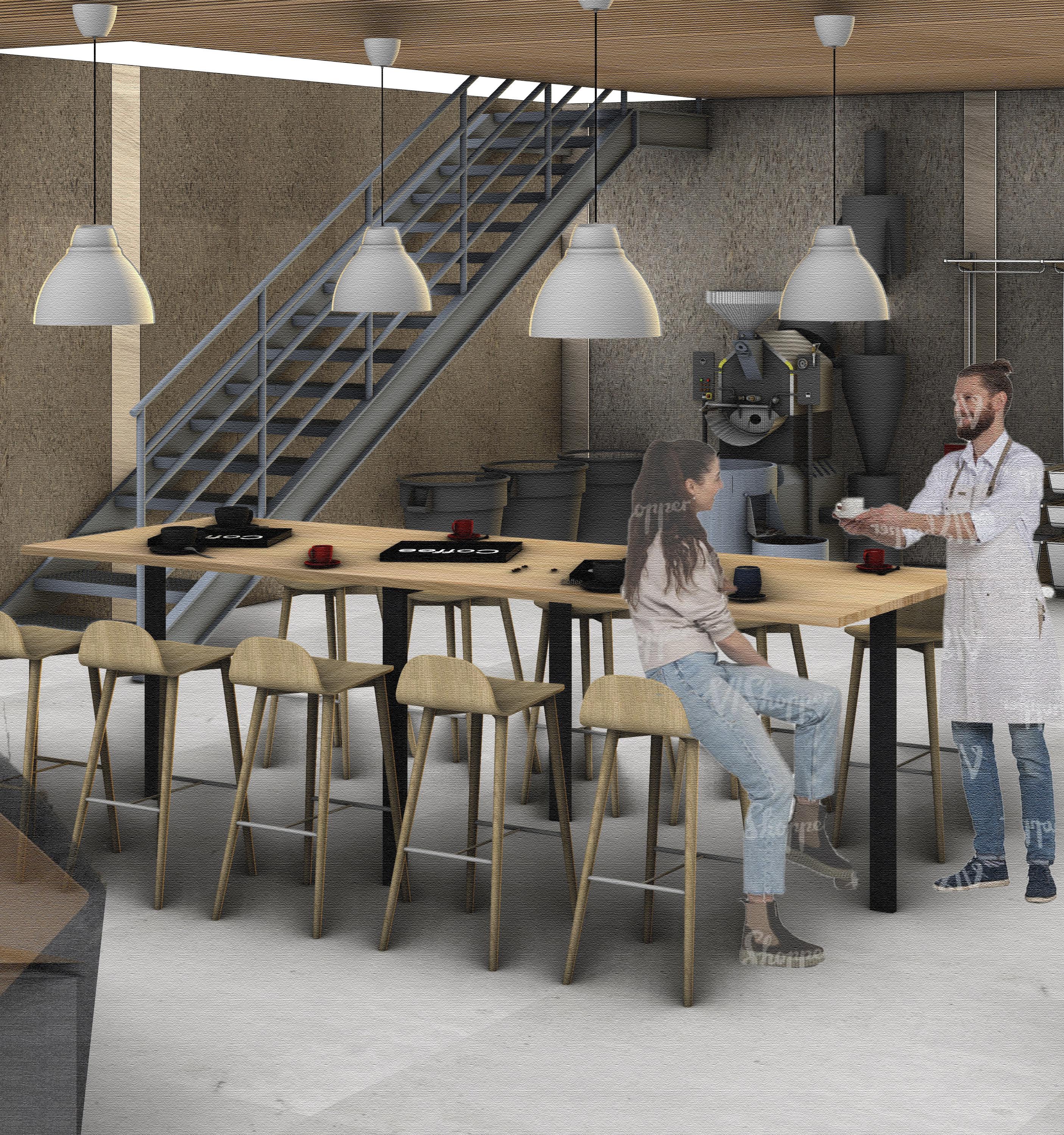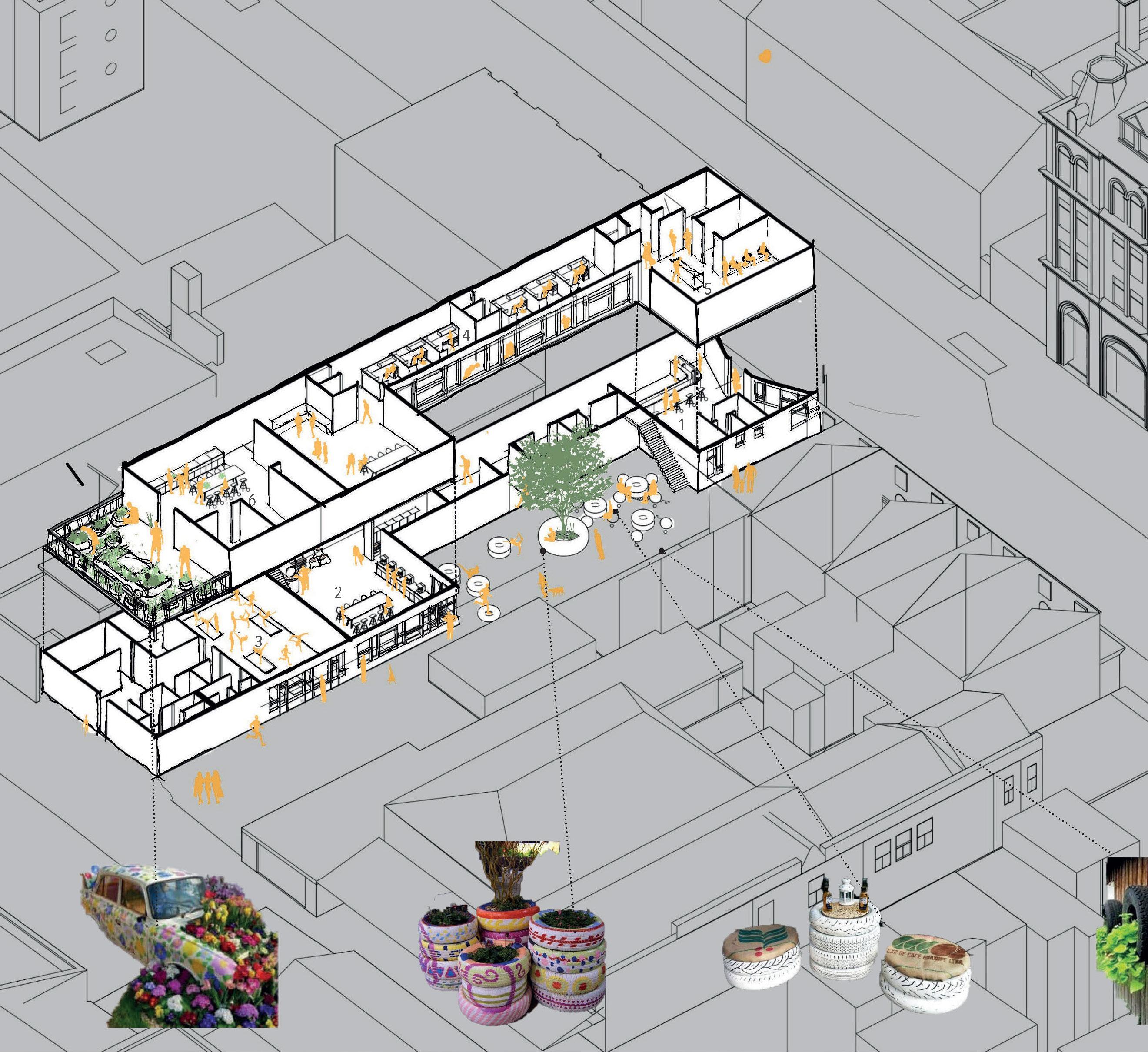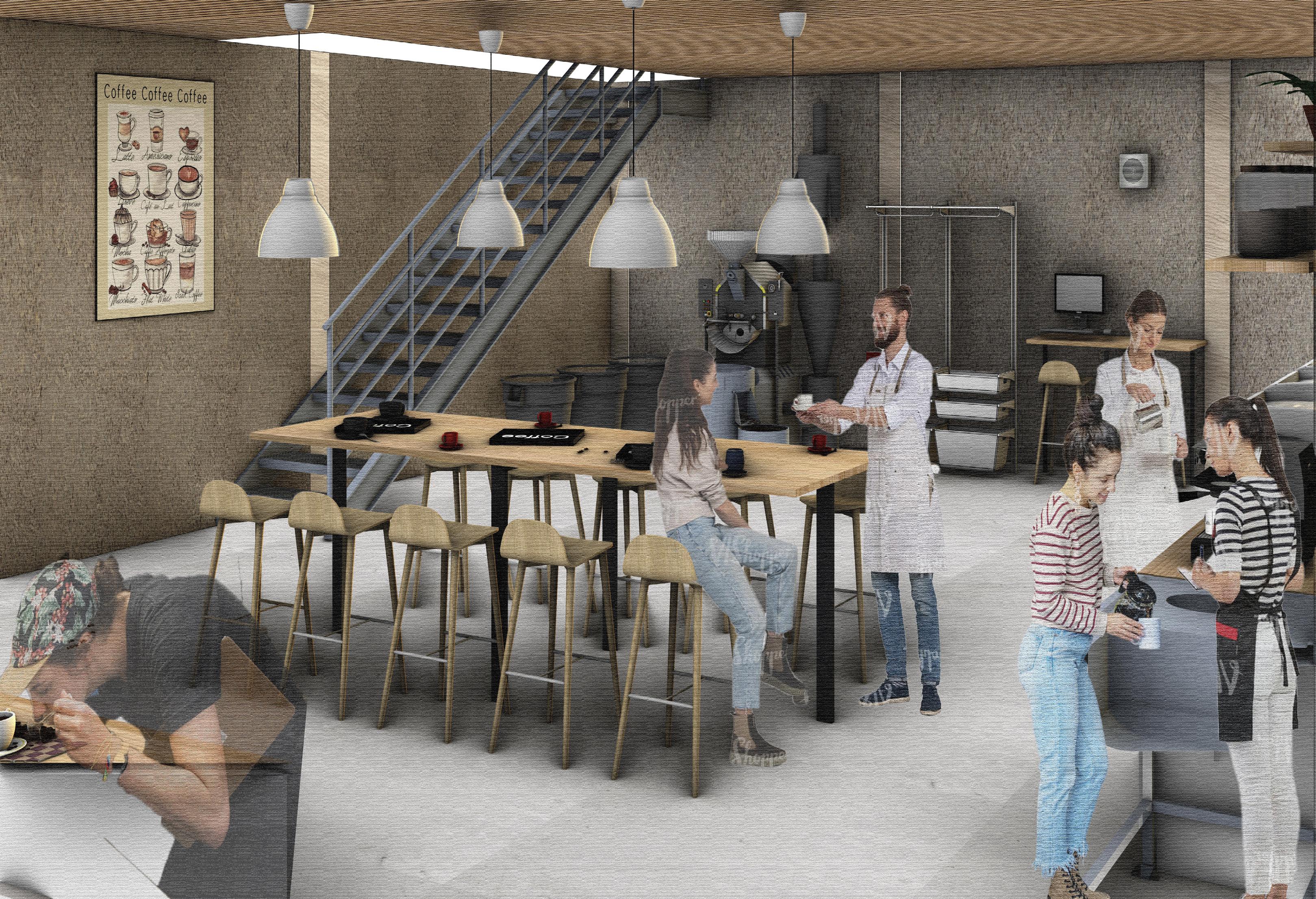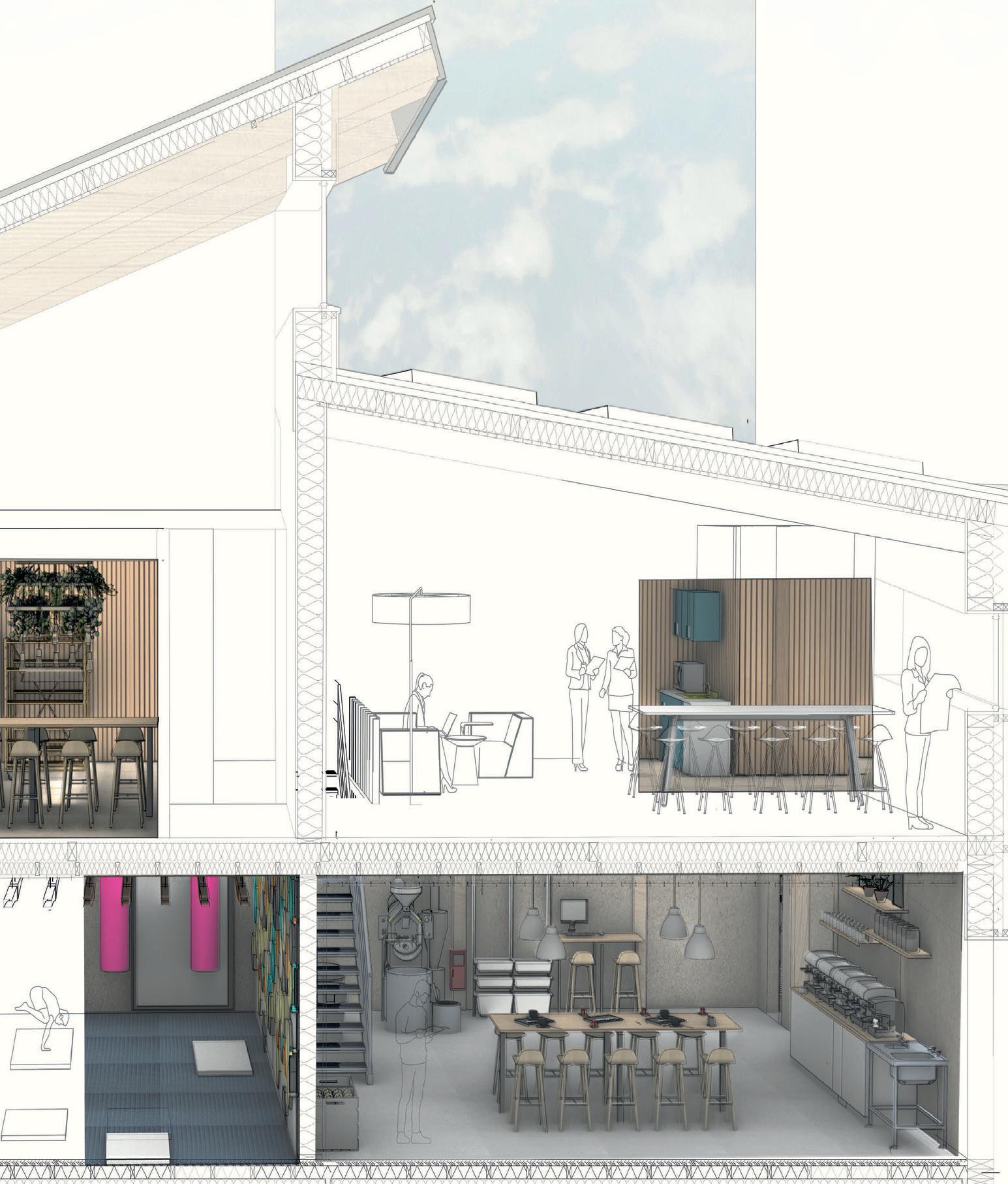 PERMANENT CORE CONCEPTS UNION CHANGERS Connecting outdoor and indoor Visual Impact Repurpose the cars parts of the existing garage ELEVATIONS [Original scale 1:100] VIEW INSIDE THE ROASTERY