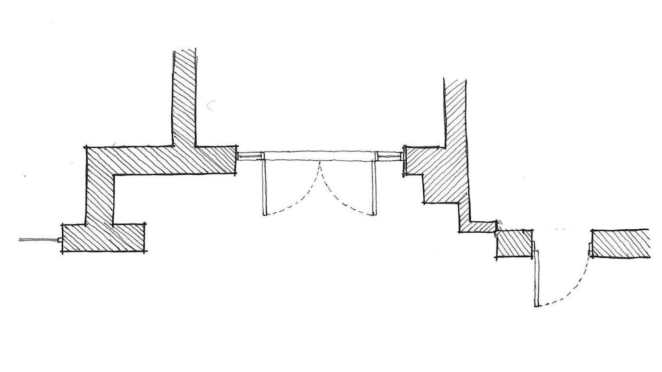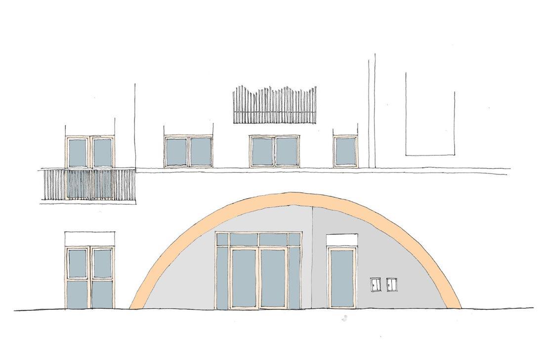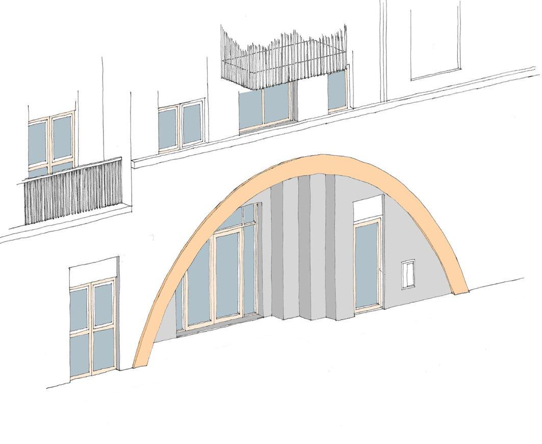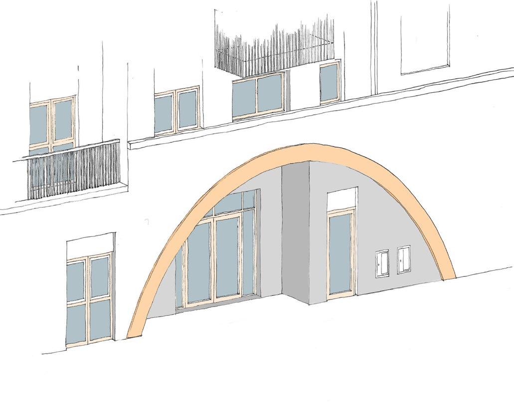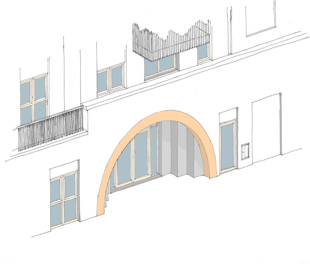 Steps were introduced to soften the recess that sits within the arch. The steps lead residents towards the entrance doors. This test retained the fire escape door within the arch, which suggest this could be part of the main entrance which we want to avoid to have a clear and legible main entrance to the building.