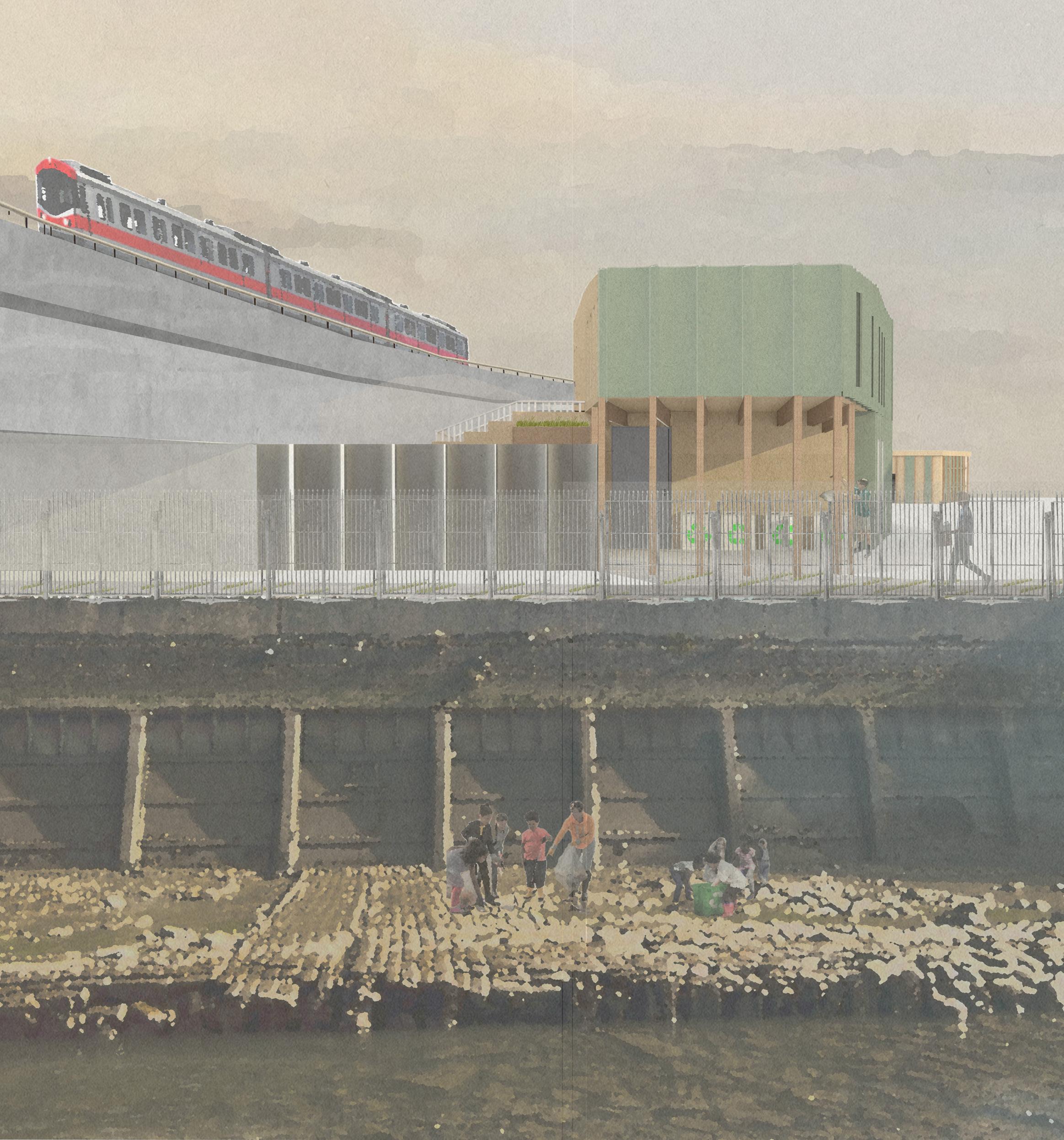 Plants prevent flooding and take excess water water into drains. Learning journey Creek Archive Rainwater collection for irrigation of the garden. Stepped garden reduces carbon on site. Ducting above suspended ceiling. Community clean up to reduce the pollution and preserve the biosphere of the creek. Ensure biodiversity on site and maintain existing habitats. Provide walking and bike friendly access. Curate community destination and active flow. Spaces for waste recycling to build sustainable community. Natural cross ventilation. The lobby acts as the centre point and gateway to the Reused construction material. Recycled plastic facade. Green area integration. Modular/ pre fab construction for low cost. Flexible spaces for future use and functions. Allow natural daylight to reduce energy demands for heating and cooling. Quality learning spaces. Non- heated spaces. 1 1 3 4 4 5 Ensure plastic waste is recycled to eeduce disposal and other costs of managing waste. Wintersun Summer sun Environmental strategy @A0 CREEKSIDE UPCYCLING MUSEUM AND FACTORY Programme From trash to treasure Research Part Upcycling Part Cultural Part Creekside Discovery Centre Find new discoveries Workshop/Factory Recycle and turn waste into something new Archive Museum Display the findings on the creek to raise awareness Impacts Society - Reduces costs to rehabilitate the environment. - Reduces disposal and other costs of managing waste. - Circular economy and provide more jobs to te community. Environment - Preserves raw materials and natural resources. - Reduces the amount of waste that requires disposal. - Preserves and keep the habitats in the creek going. Goals - Educate and interest the community in understanding the ecology of Depftord Creek. - Provide to visitors a clear idea about the history and uses of recycling and explore how it is done. - Make more researches regarding waste management studies and sustainability. Take Make Consume Repair Reuse Recycle