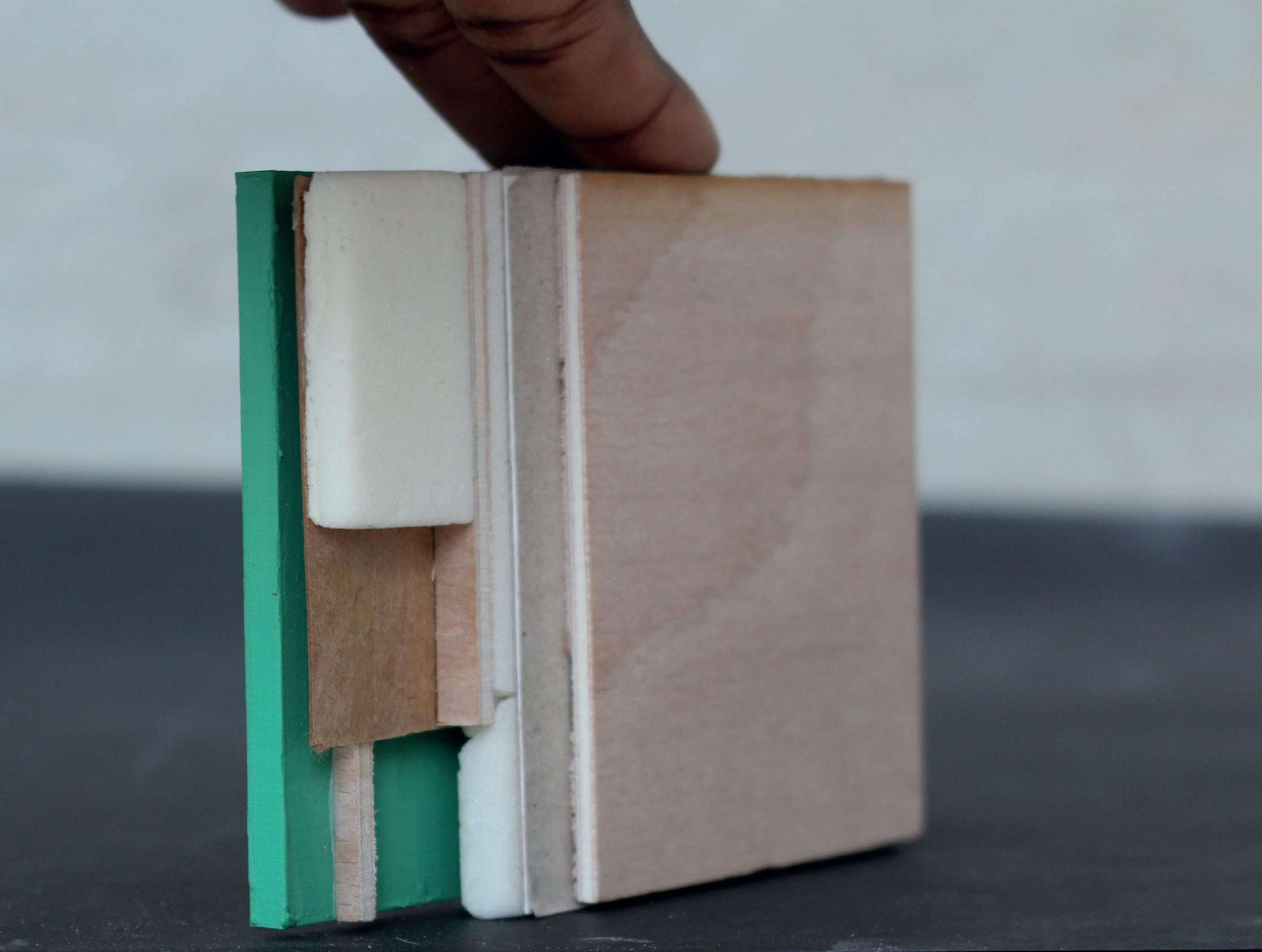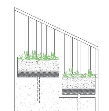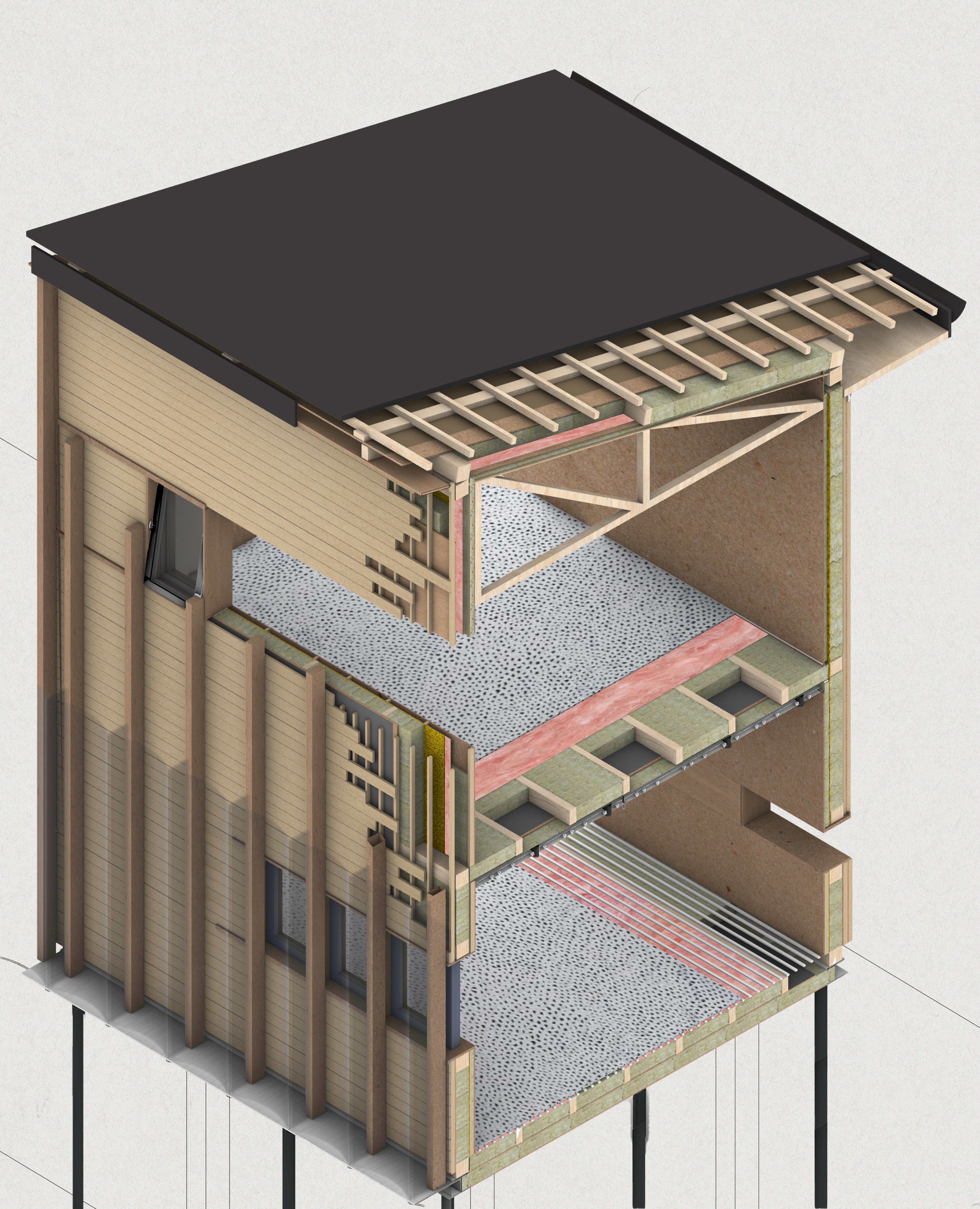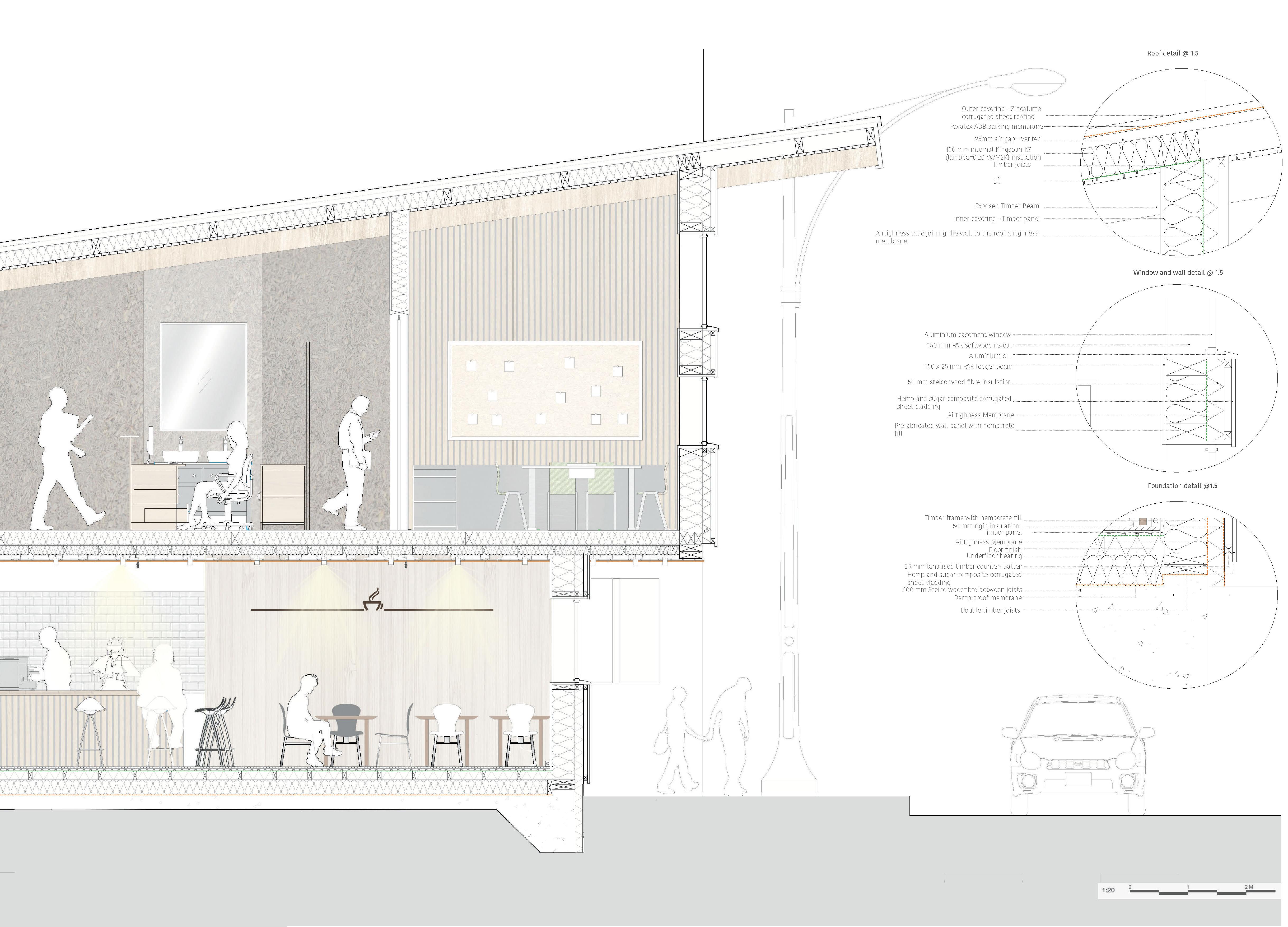 LVL panels as ceiling elements. LVL panels supporting the stepped ceiling. LVL panels supporting the pitched roof. Exposed CLT on the inside Fire rate inside 30/30/30 Elevation This facade module will be applied only to one side of the building. @1:50 Understanding the assembly of Nottingham Comtemporary facade. assembly Recycled plastic facade structure Airtight Insulation between timber frame Vapour membrane Timber battens for the assembly of the facade. Exposed CLT on the inside Fire rate inside 30/30/30 Fire rate outside 60/60/60 Elevation This facade module will be applied only to one side of the building. @1:50 Understanding the assembly of Nottingham Comtemporary facade.