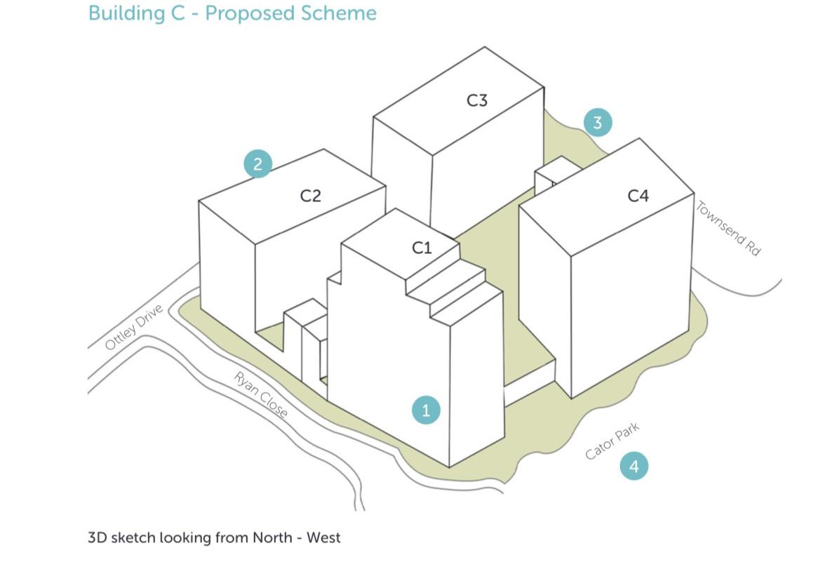 The architectural language of the entrance to Building C1 has been developed making reference to the consented scheme.