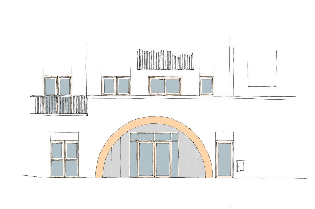 The arched entrance, present in the consented design, has been developed to include an integrated canopy as required by AD Part M. To achieve this the entrance door has been pushed back as a recess within the arch.