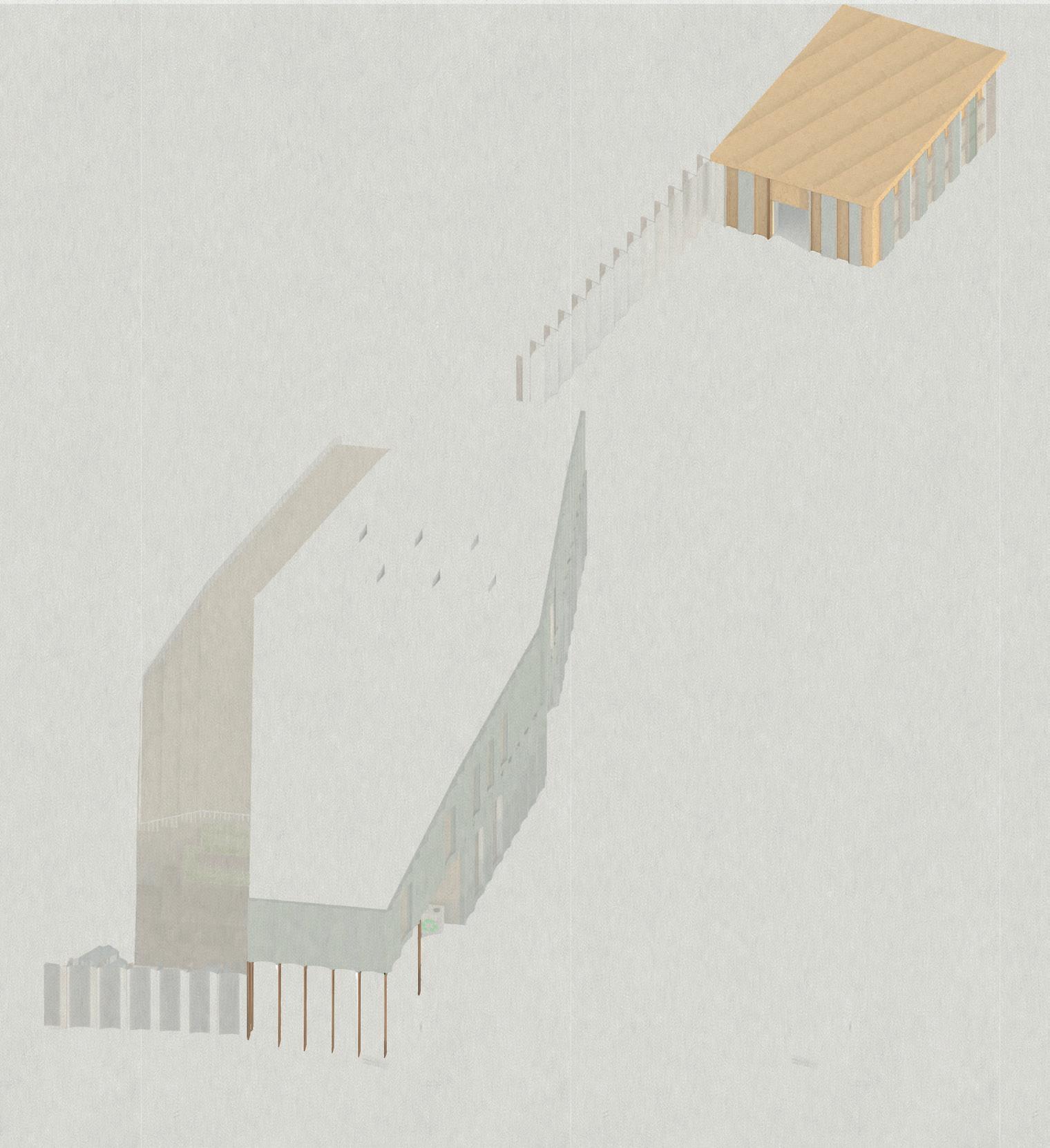 CREEKSIDE UPCYCLING MUSEUM AND FACTORY 2000mm 2000mm 2000mm 1800mm Each panel up to 2000 mm long, having some of them shorter to fit the building grid. Primary Structure Primary Structure Primary Structure Primary Structure Secondary Structure Secondary Structure Tertiary Structure Secondary Structure elegant construction/aesthetic. LVL panels as ceiling elements. LVL panels supporting the stepped ceiling. LVL panels supporting the pitched roof.