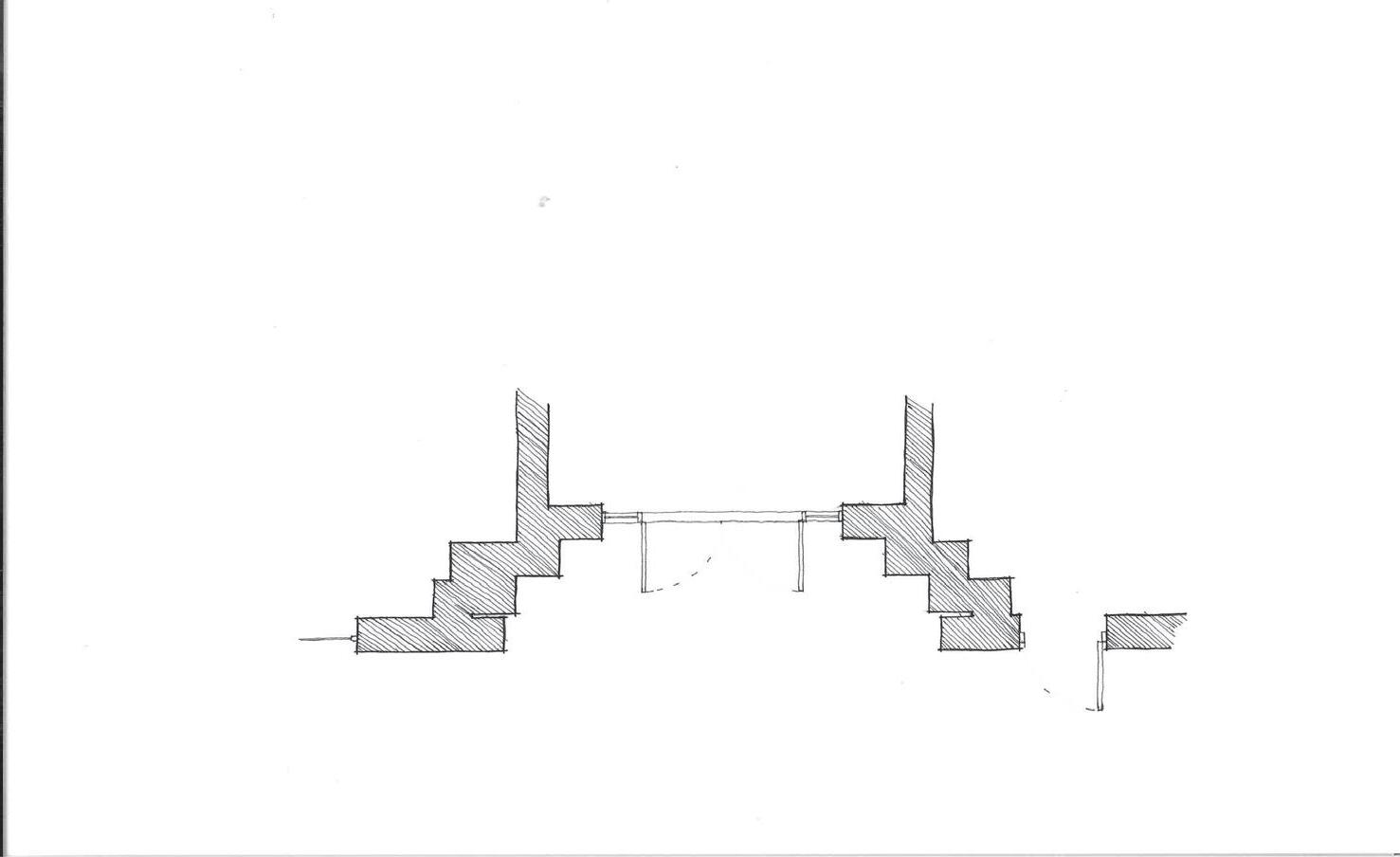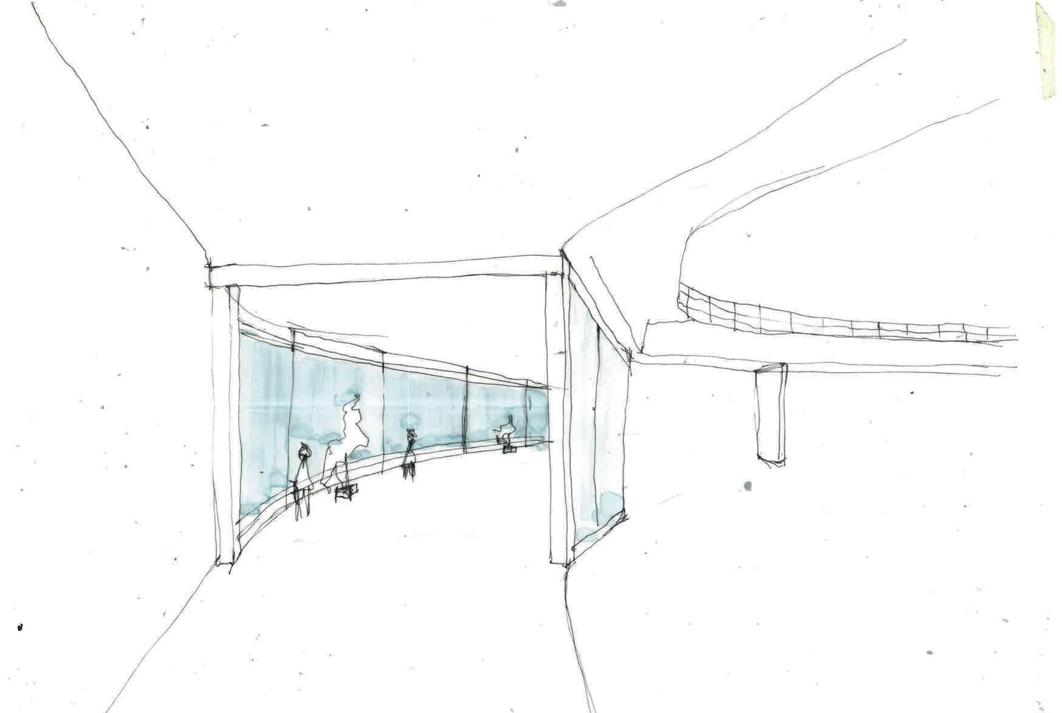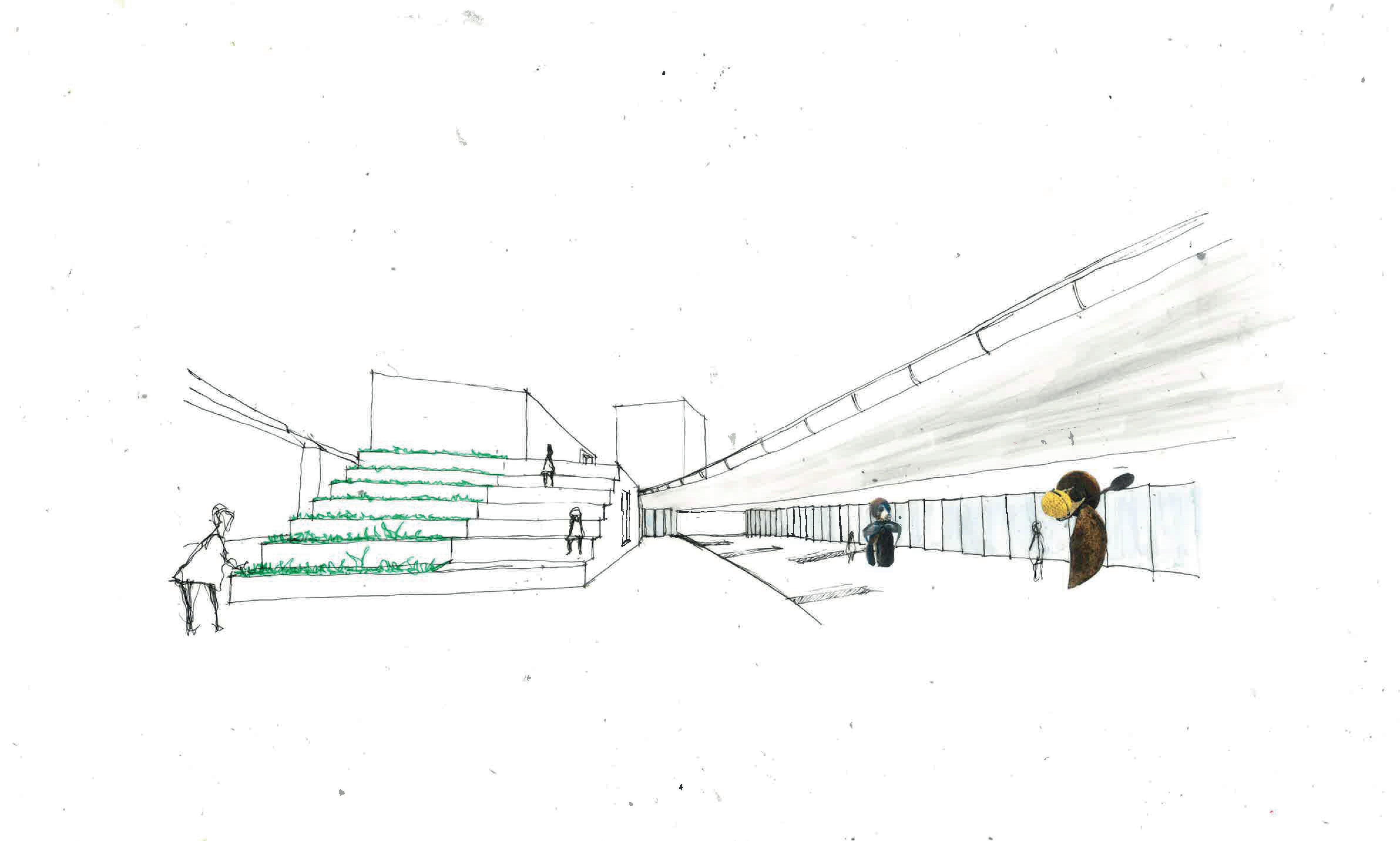 CREEKSIDE UPCYCLING CENTRE VIEW FROM THE ENTRANCE LOOKING INSIDE THE BUILDING INITIAL SKETCH A B C c B A