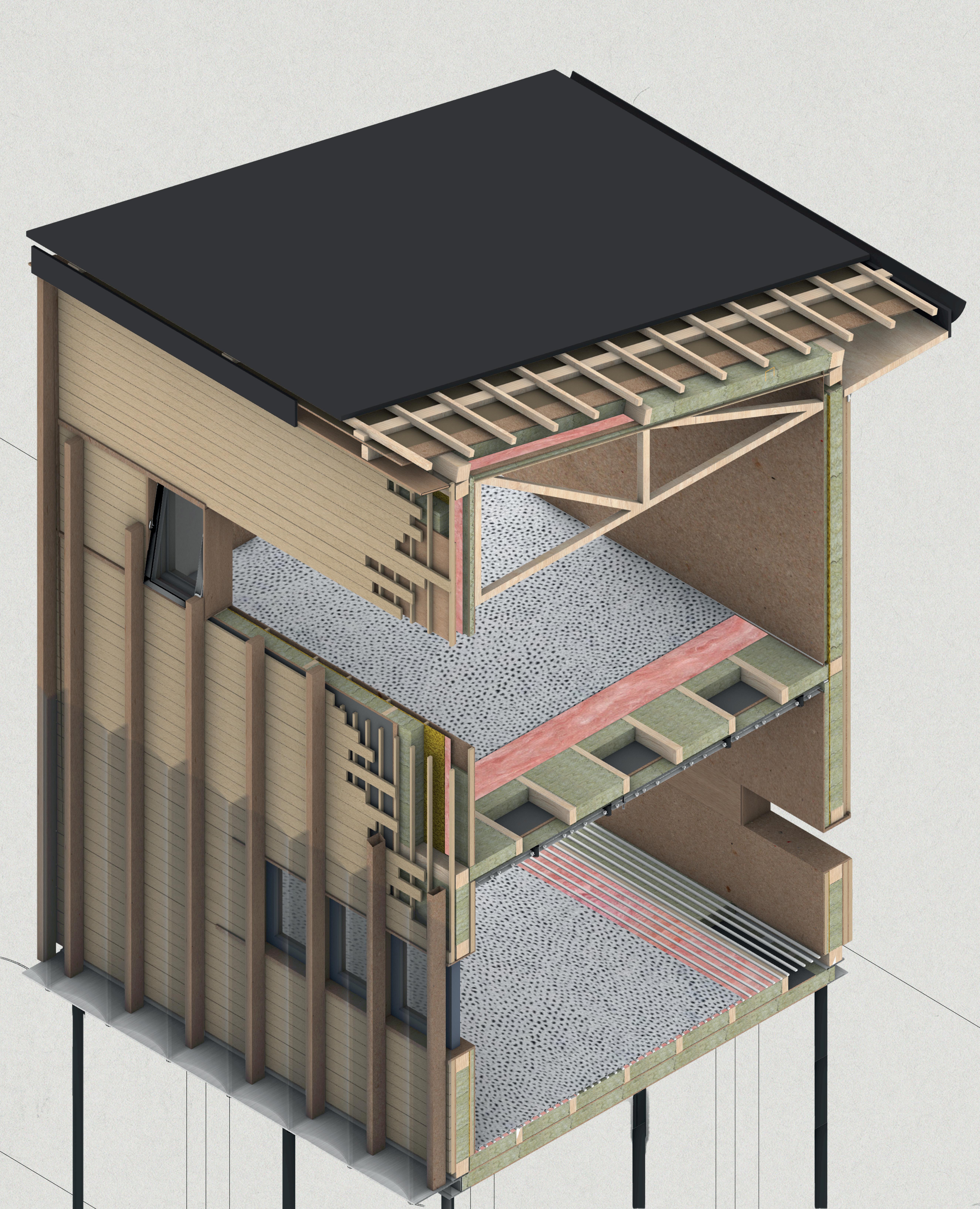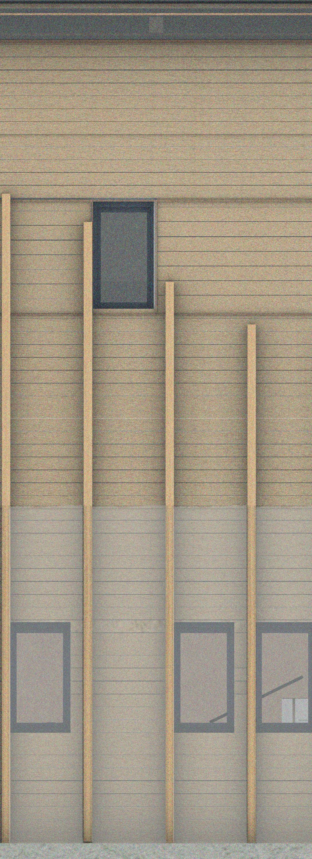 LVL panels as ceiling elements. LVL panels supporting the stepped ceiling. LVL panels supporting the pitched roof. Exposed CLT on the inside Fire rate inside 30/30/30 Elevation This facade module will be applied only to one side of the building. @1:50 Understanding the assembly of Nottingham Comtemporary facade. assembly Recycled plastic facade structure Airtight Insulation between timber frame Vapour membrane Timber battens for the assembly of the facade. Exposed CLT on the inside Fire rate inside 30/30/30 Fire rate outside 60/60/60 Elevation This facade module will be applied only to one side of the building. @1:50 Understanding the assembly of Nottingham Comtemporary facade.