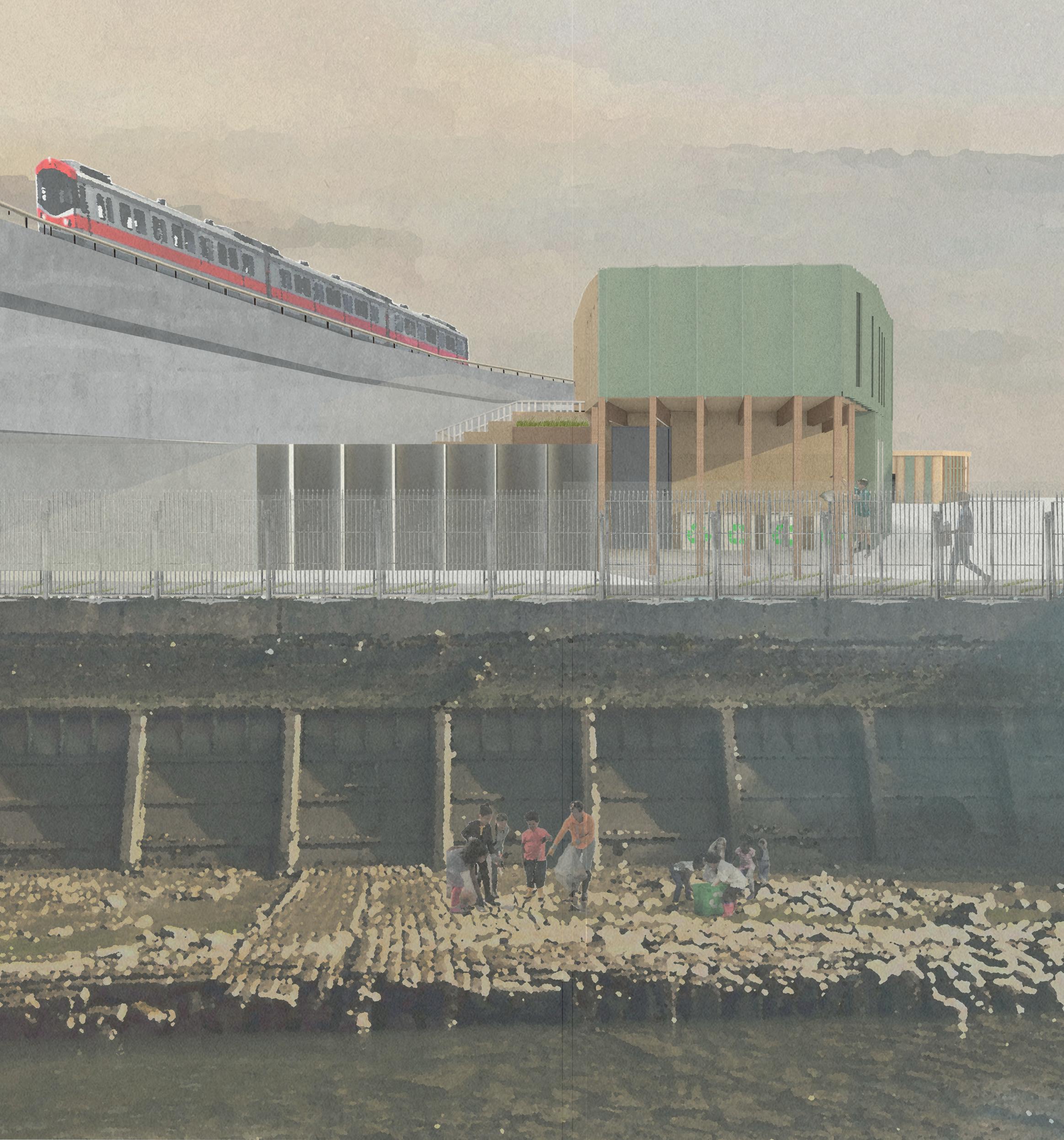 Plants prevent flooding and take excess water water into drains. Learning journey Creek Archive Rainwater collection for irrigation of the garden. Stepped garden reduces carbon on site. Ducting above suspended ceiling. Community clean up to reduce the pollution and preserve the biosphere of the creek. Ensure biodiversity on site and maintain existing habitats. Provide walking and bike friendly access. Curate community destination and active flow. Spaces for waste recycling to build sustainable community. Natural cross ventilation. The lobby acts as the centre point and gateway to the Reused construction material. Recycled plastic facade. Green area integration. Modular/ pre fab construction for low cost. Flexible spaces for future use and functions. Allow natural daylight to reduce energy demands for heating and cooling. Quality learning spaces. Non- heated spaces. 1 1 3 4 4 5 Ensure plastic waste is recycled to eeduce disposal and other costs of managing waste. Wintersun Summer sun Environmental strategy @A0 CREEKSIDE UPCYCLING MUSEUM AND FACTORY Programme From trash to treasure Research Part Upcycling Part Cultural Part Creekside Discovery Centre Find new discoveries Workshop/Factory Recycle and turn waste into something new Archive Museum Display the findings on the creek to raise awareness Impacts Society - Reduces costs to rehabilitate the environment. - Reduces disposal and other costs of managing waste. - Circular economy and provide more jobs to te community. Environment - Preserves raw materials and natural resources. - Reduces the amount of waste that requires disposal. - Preserves and keep the habitats in the creek going. Goals - Educate and interest the community in understanding the ecology of Depftord Creek. - Provide to visitors a clear idea about the history and uses of recycling and explore how it is done. - Make more researches regarding waste management studies and sustainability. Take Make Consume Repair Reuse Recycle