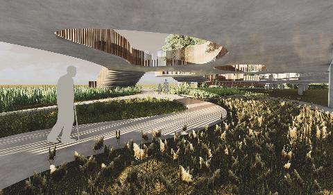 The three buildings rest on concrete columns and panels, giving them a strong, lasting presence. Wooden battens add warmth and texture to the façades, softening the material palette. Above, layered concrete and timber elements form a roof that filters light throughout the day, evoking traditional weaving and celebrating craft and culture.