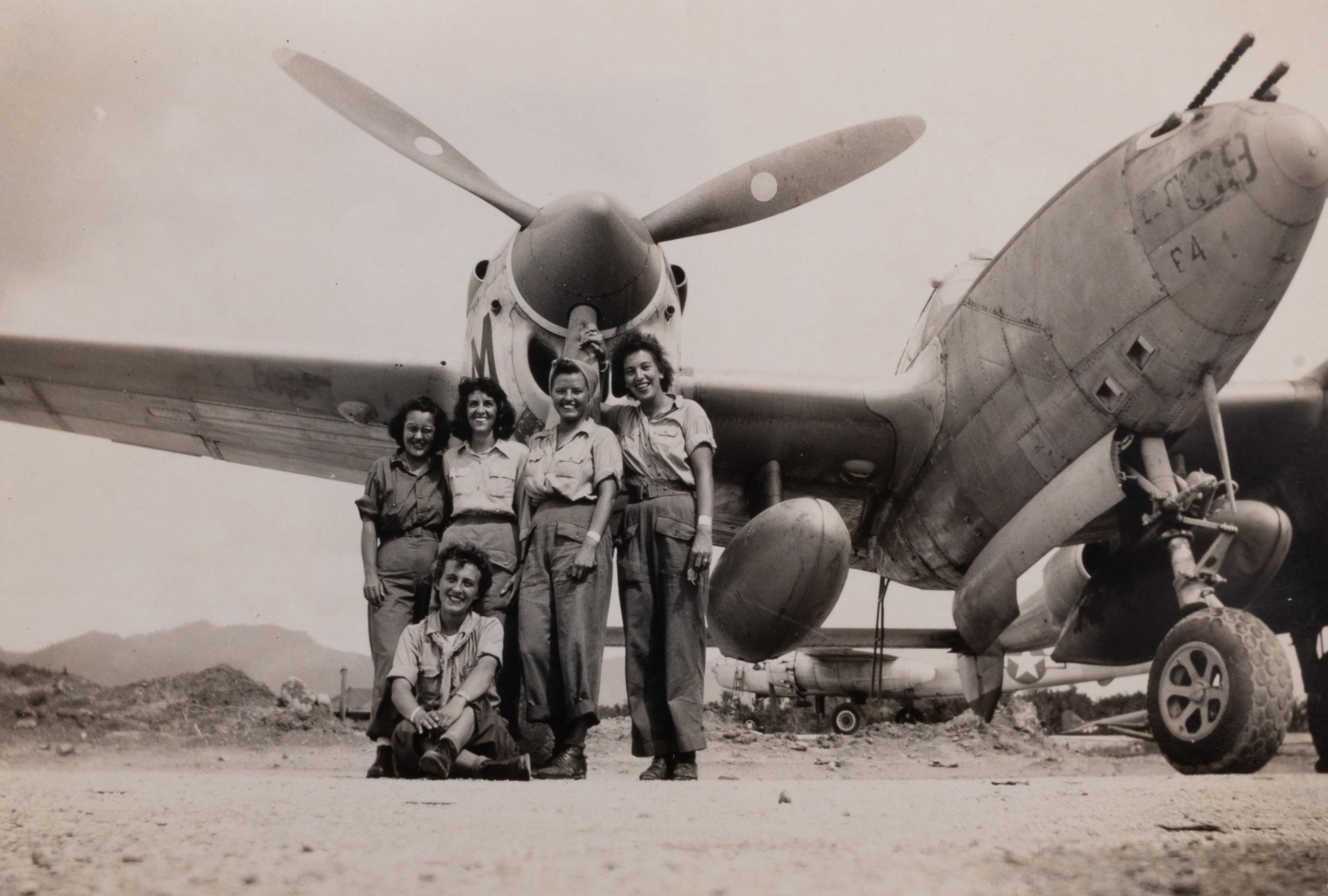 “January 1944 marked the arrival of the first WAC in the Pacific Theater of Operations,” such as Phyllis Peirce (standing second from left) pictured here enjoying a moment of camaraderie posing in front of a Lockheed P-38 aircraft.