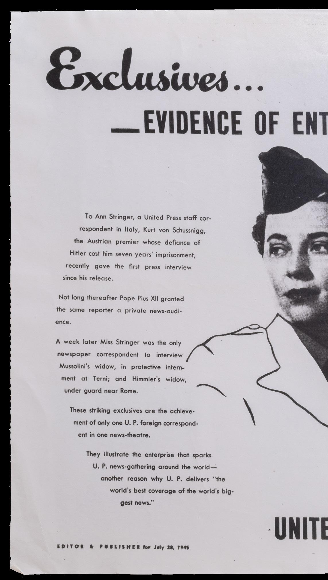 The Ann Stringer collection contains 38 photographs of Stringer on assignment as a foreign correspondent, and photocopies of articles written by Stringer in Europe during and after World War II.