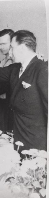 (Left) Stringer, center, stands for a toast during a dinner with her Russian hosts on a tour of the Russian zone inside Germany.